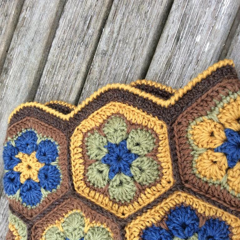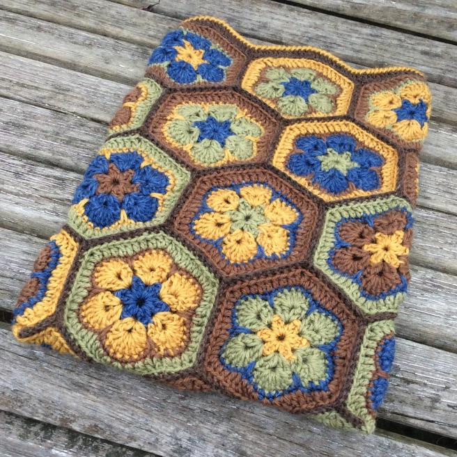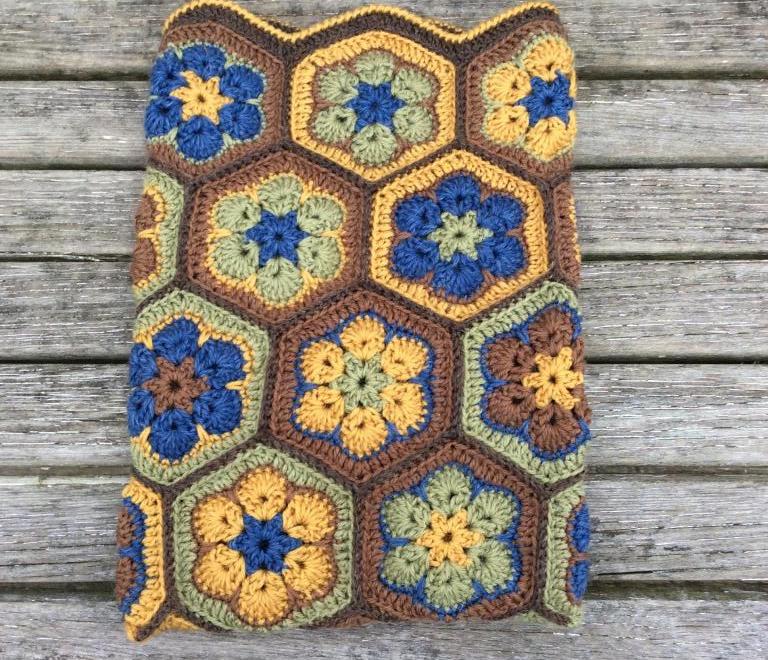 Virkatuista kuusikulmaisista afrikankukista saat helposti koottua suojan iPadille tai läppärille. Tarvittava afrikankukkien määrä riippuu afrikankukkapalojen koosta sekä myös läppärin tai tabletin koosta.