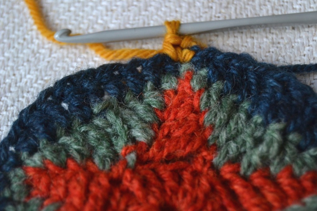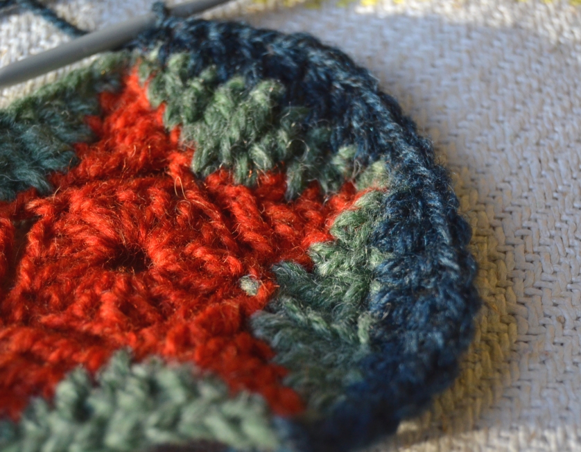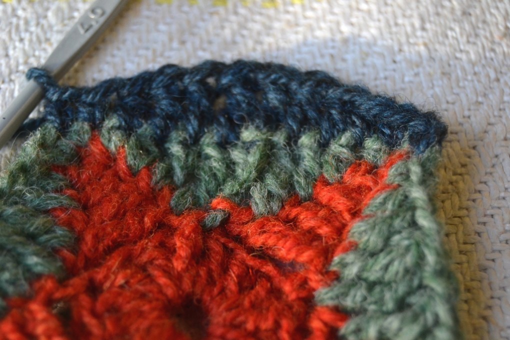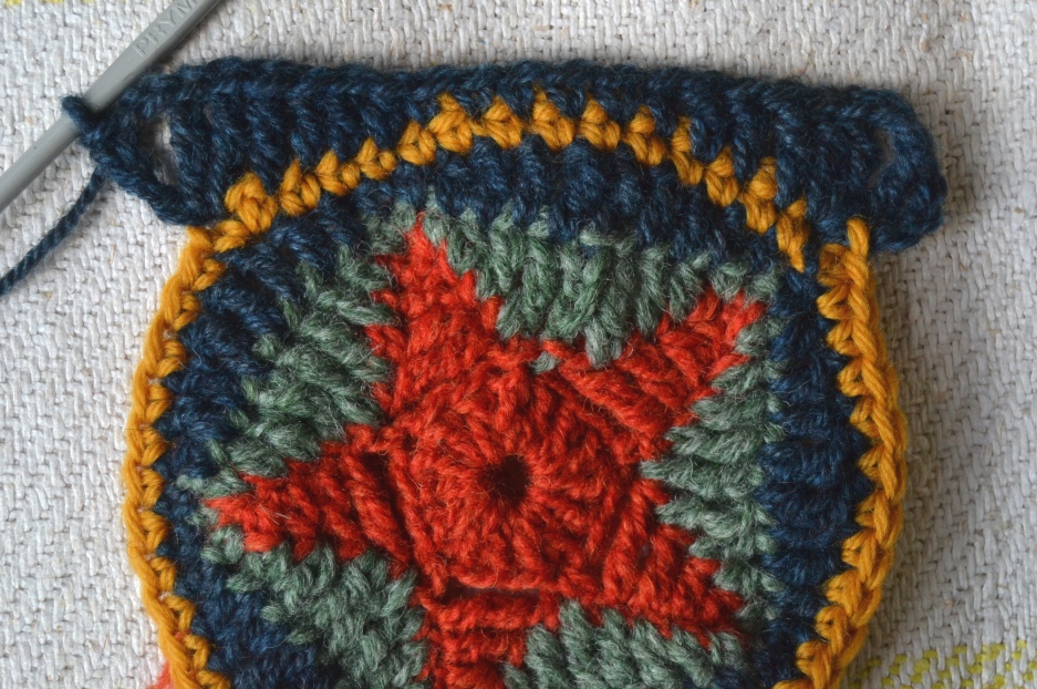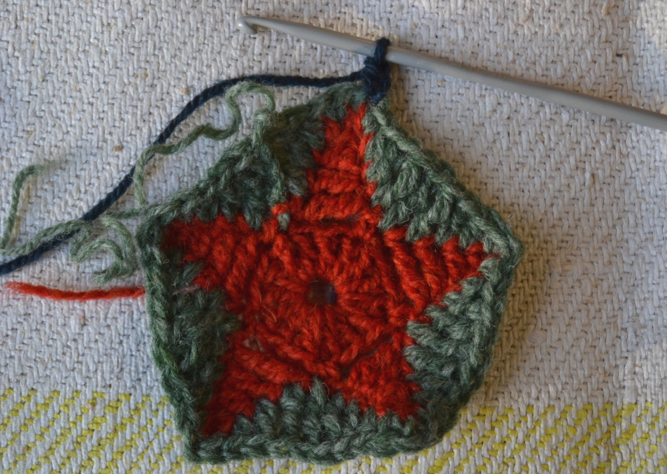 Kolmas väri (sininen). Aloita 5-kulmion kärjestä. Tee kaksi ketjusilmukkaa (=1 ks), 1 puolipylväs, 2 pylvästä, 2 pitkää pylvästä, 2 pylvästä, 1 puolipylväs, 1 ks. Yksi 5-kulmion kylki on pyöristetty ympyrän kaareksi. Jatka samoin seuraavat neljä kylkeä. Sulje piilosilmukalla alun toiseen ketjusilmukkaan. Älä katkaise tai päättele lankaa, sillä samalla värillä tulee vielä yksi kerros. Tai toki voit muutella väritystä ja värijärjestystä mielesi mukaisesti.