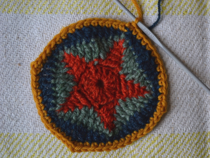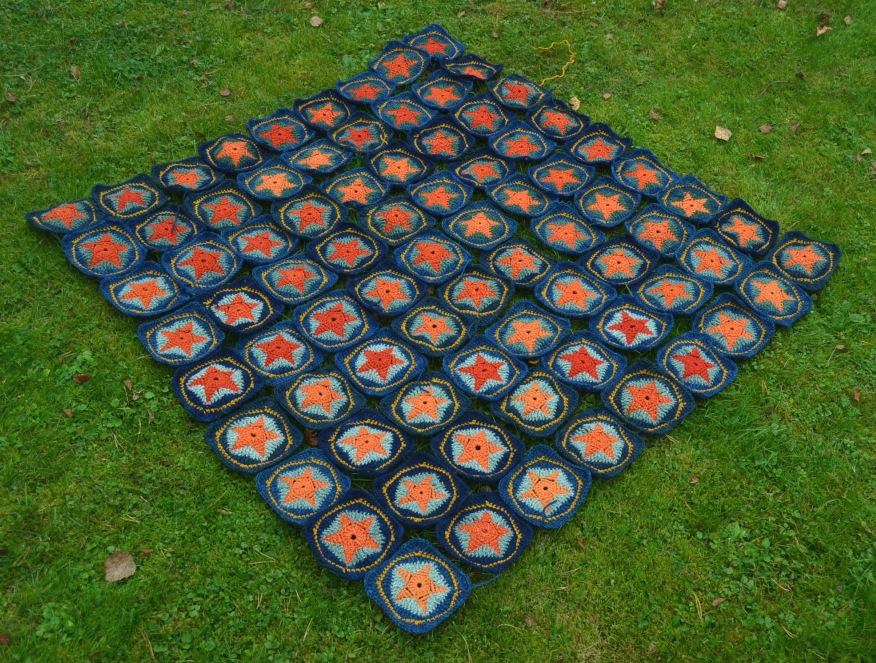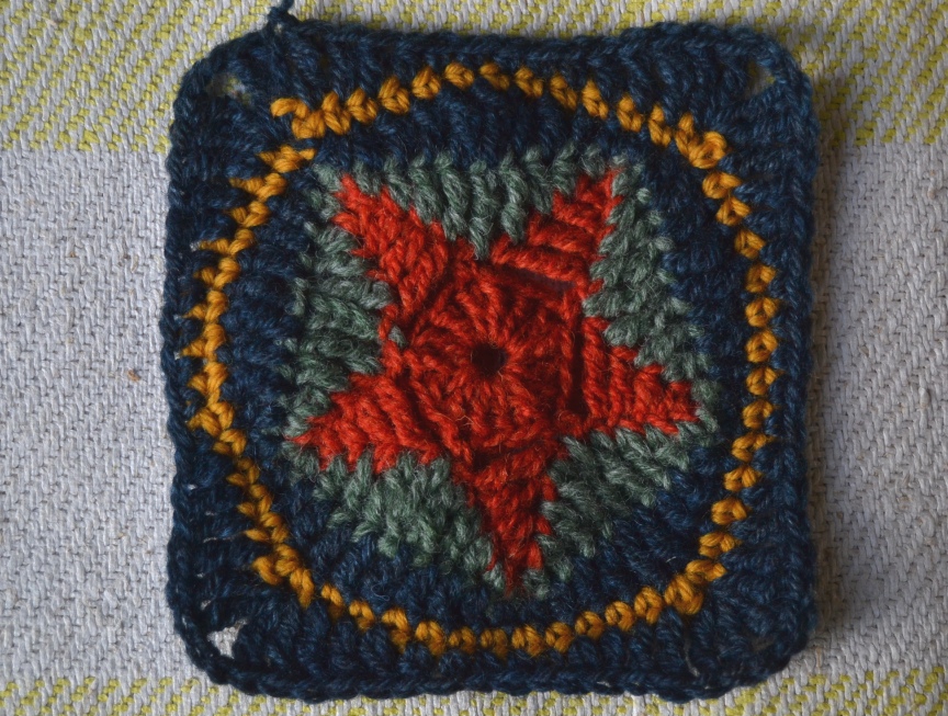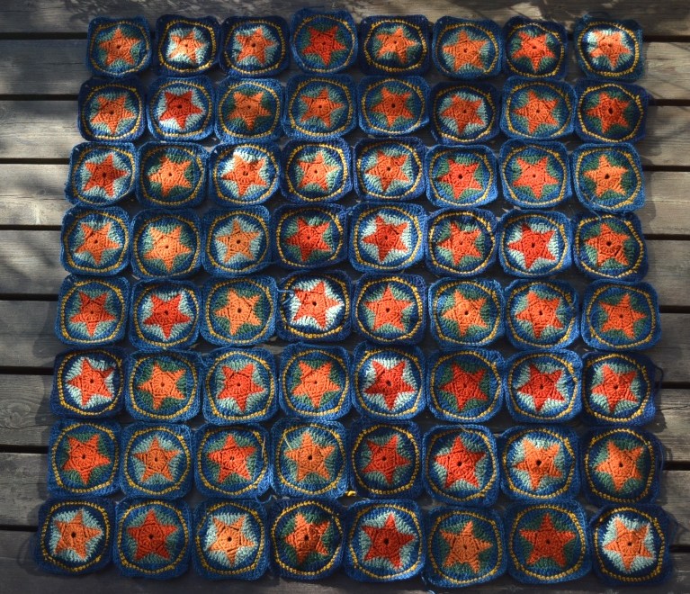 Käytin tähtiruudoissa pääosin Pirtin kehräämön karstalankaa 140 tex x 3, oranssi ja vihreä ovat liukuvärjättyjä, siniset ovat vähän erisävyisiä itsevärjättyjä indigokokeiluja. Keltainen lanka on Hjärte Garnin Lima-villalankaa. Käytin koukkua numero 4. Ruudut ovat pingotettuina noin 14 x 14 cm kokoisia.