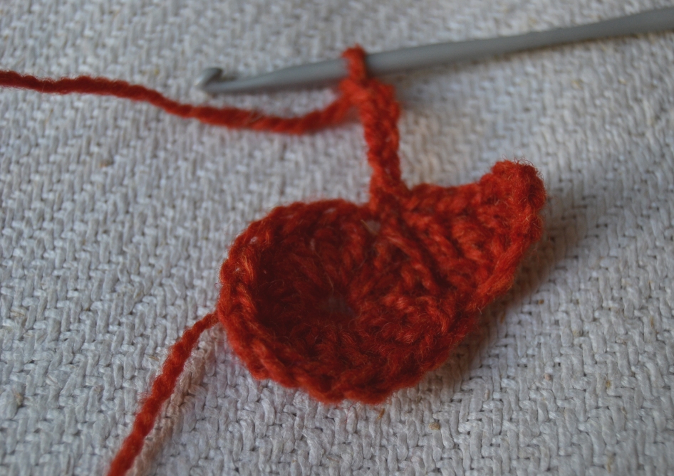 Jatka samalla värillä (oranssi). 5 kjs, 1 ks 2. kjs:ään, seuraaviin 1 puolipylväs, 1 pylväs, 1 pitkäpylväs. Kiinnitys 1. Kerroksen 3:een pylvääseen 1 kiinteällä ketjusilmukalla.