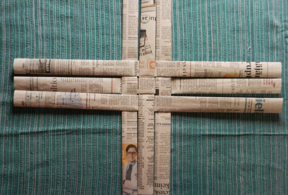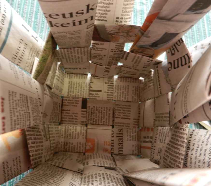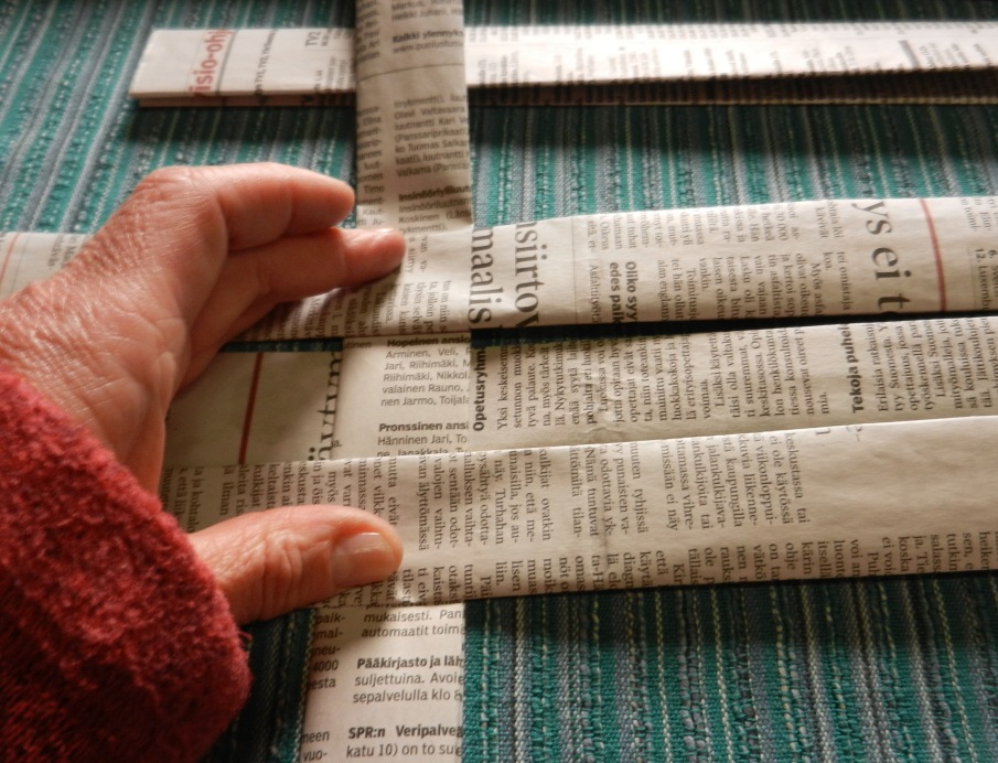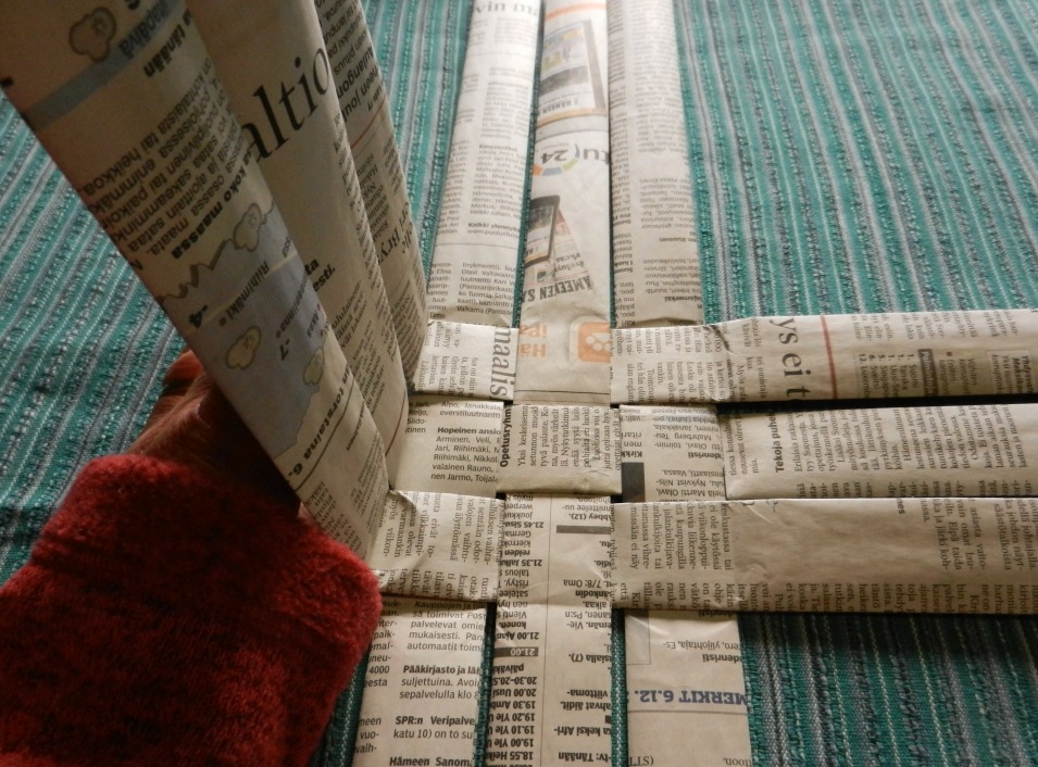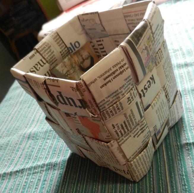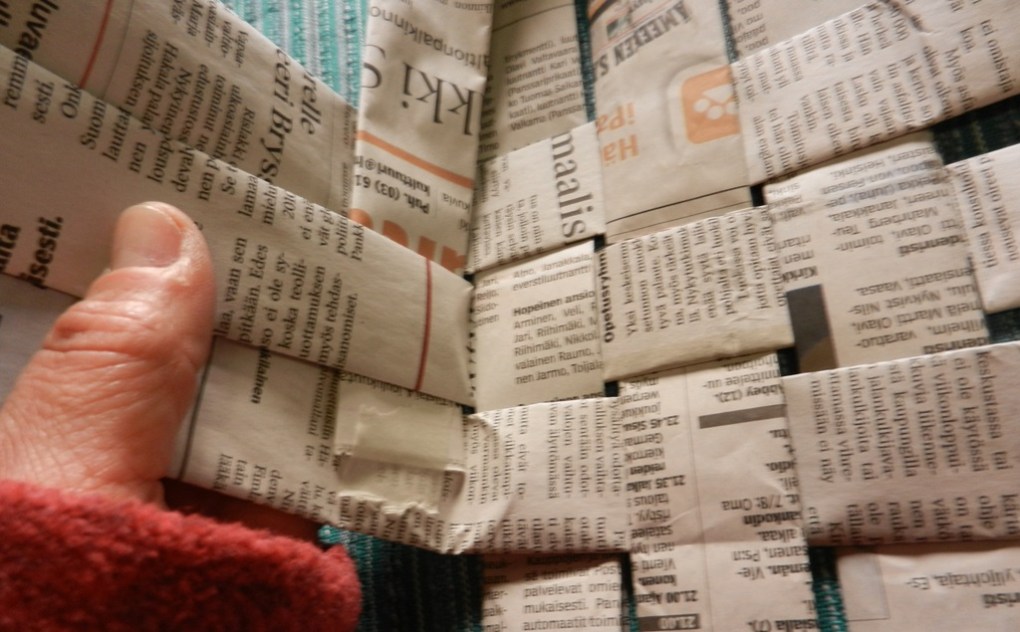 Maakuntalehden yhden päivän numerosta saa yhden korin. Saattaa jopa jäädä pari sivua toista koppaa varten, jos on oikein hyvä uutispäivä, teemanumero tai paljon mainoksia alennusmyyntien aikaan. Punomista auttaa, jos käytössä on vähän maalarinteippiä ja pyykkipoikia. Saksillekin on vähän tarvetta.