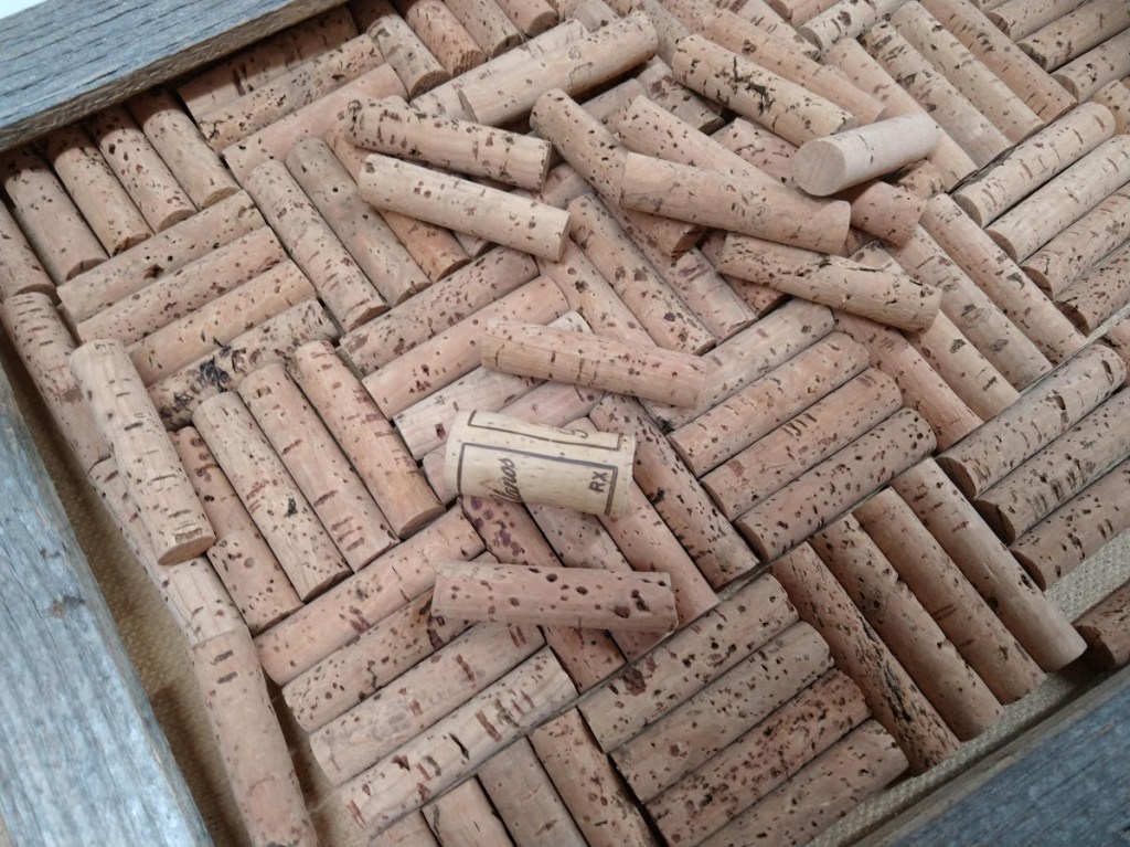 Sain työkaverilta kesällä kassillisen käyttämättömiä korkkeja. Ja toinen työkaveri kiikutti jo aikaisemmin muutaman puukehyksen työhuoneeseeni jatkokäyttö varten. Ylimääräinen mutta käyttökelpoinen tavara hakeutuu kierrättäjän ja hamsterin luo. Nyt korkit ja kehys hakeutuivat yhteen.