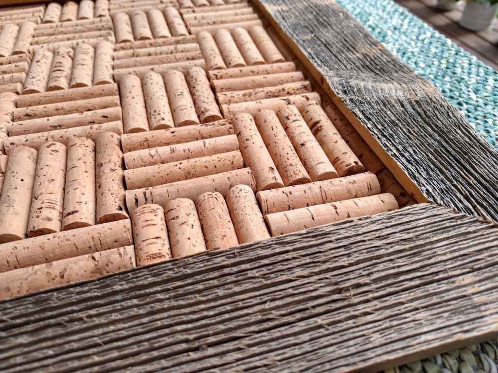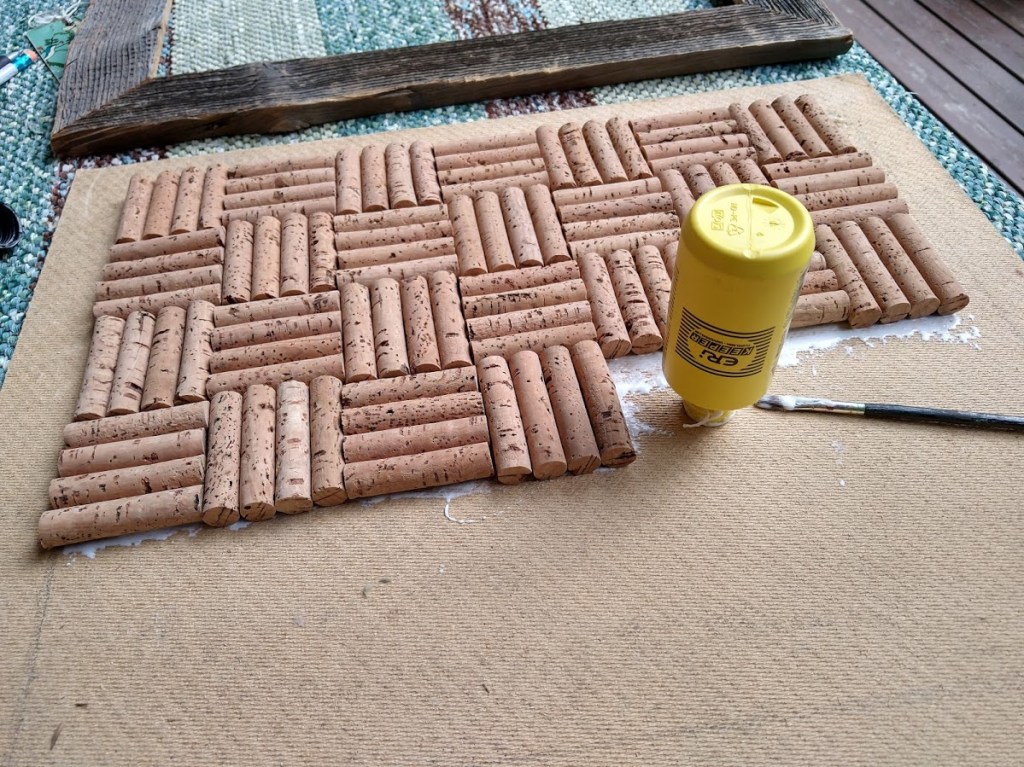 Piirsin pahville taulun mitat ja levitin maitoliimaa alue kerrallaan. Asettelin korkit liimaiselle pahville vieri viereen – vuorotellen neljä korkkia vaaka- ja pystysuuntaan. Tämä asettelu ei toimi samoin pienemmillä viinipullonkorkeilla. Viinipullonkorkeista voi laittaa kaksi korkkia vaaka- ja pystysuoraan vuorotellen, niin saa saman korinpohjafiiliksen.