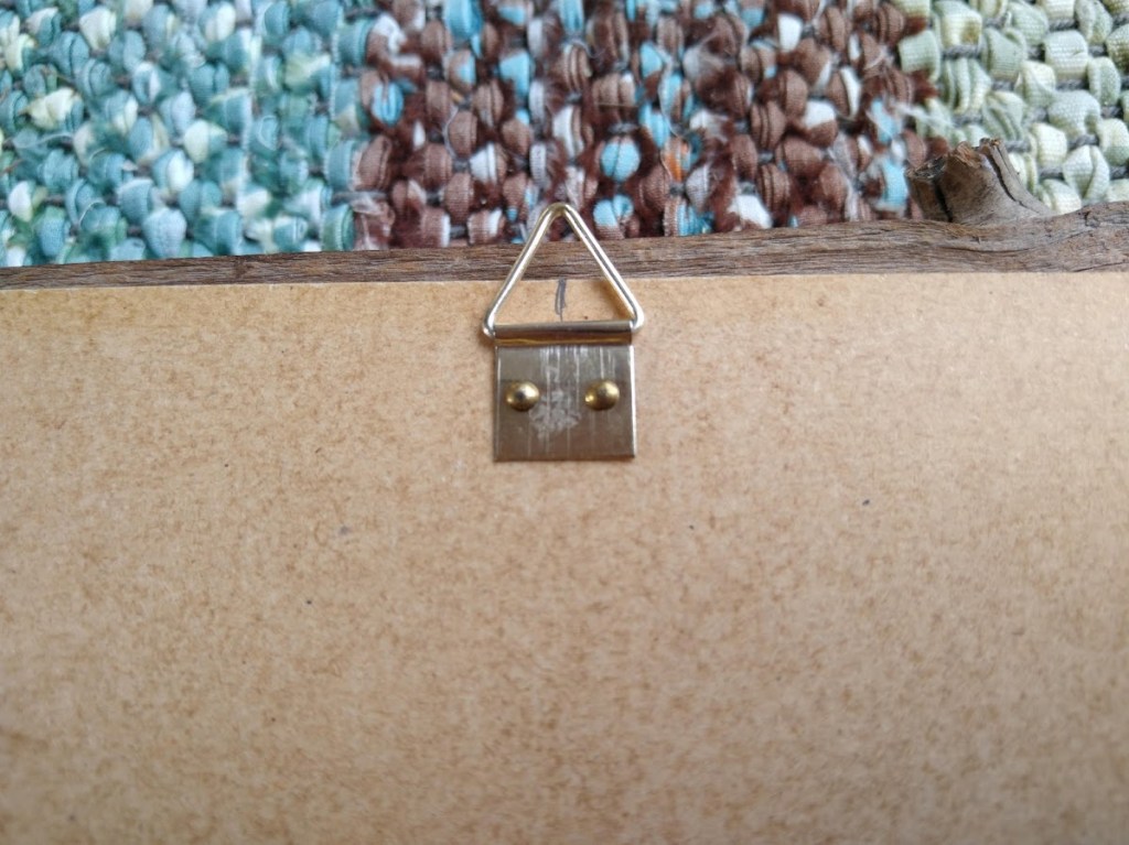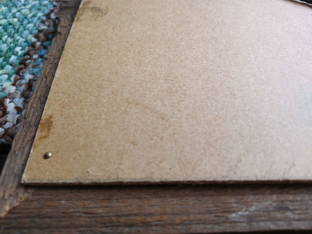 Käänsin taulun toisinpäin. Kiinnitin pahvin kehykseen muutamalla lyhyellä naulalla ja laitoin kehyksen yläreunaan keskelle taulukoukun.