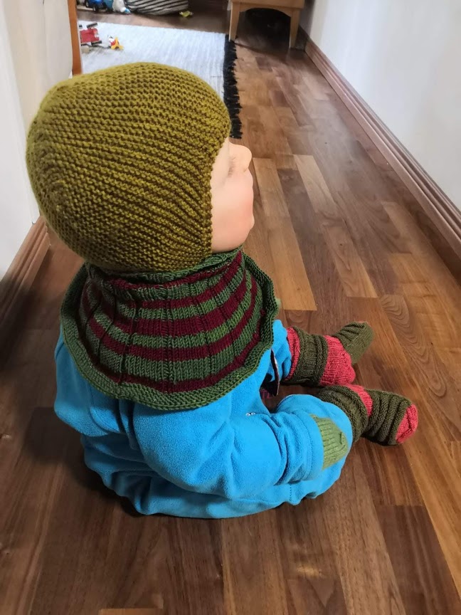 Neuloin pyynnöstä kaulurin noin yksi vuotiaalle. Kaulurimalli on todettu erittäin hyväksi isoveljen 2 vuoden käytössä. Kauluri asettuu hyvin kaulalle, suojaa hartiat ja pysyy hyvin haalarin tai takin alla. Vanha kauluri toimi mallina uudelle, koska siitä oli helppo laskea silmukat, kerrokset ja levennykset. Mallin olen bongannut aikanaan somessa näkemästäni kuvasta eli malli ei ole alunperin minun keksintö.