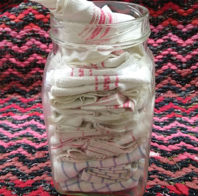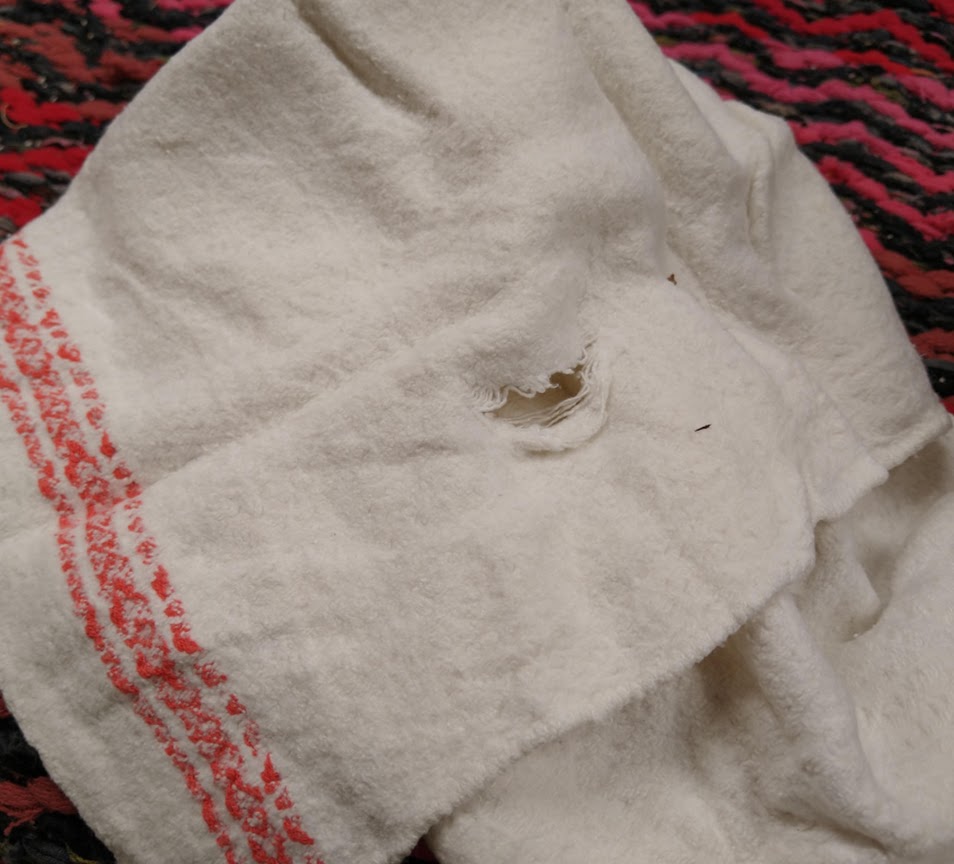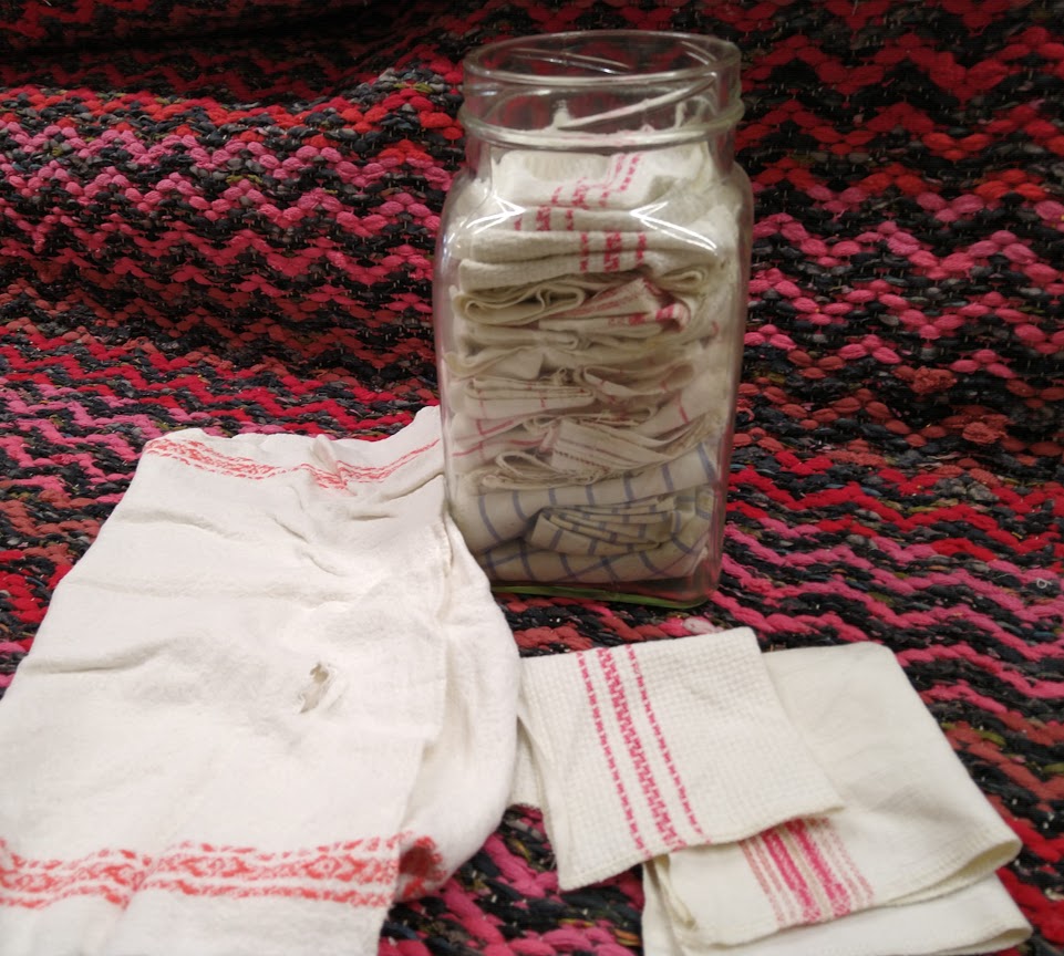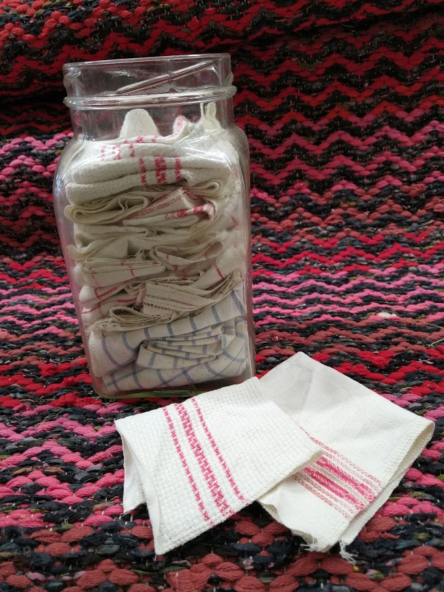 Vanhat keittiöpyyhkeet ovat kestäneet mummolta äidin kautta tyttärelle. Osa edelleen seuraavalle sukupolvelle. Eivät tosiaankaan ole kertakäyttötuotteita. Mutta niin vaan nekin kuluvat käytössä, tulee reikiä ja joskus myös tahroja, joita on vaikea saada pois. Pois niitä en raaski heittää siltikään hyvän imukykynsä vuoksi. Ja on vanhoissa pyyhkeissä myös tunnearvoa, sukupolvien tarinoita ja kirjottuja nimikirjaimia.