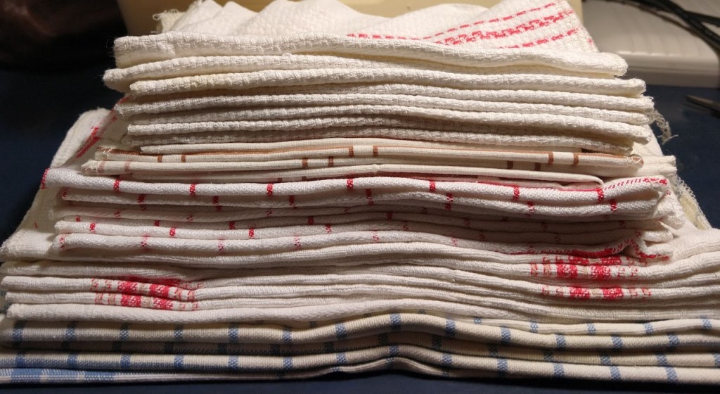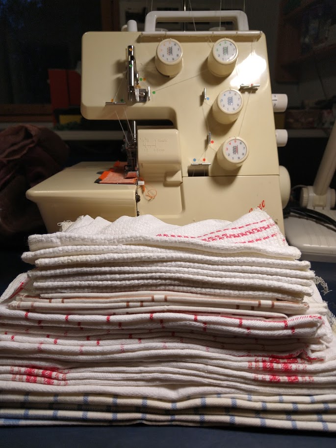 Viimeisin kestoprojektini oli 5 käytöstä pois joutuneen keittiöpyyhkeen pilkkominen saumurilla sopivankokoisiksi kestotalousliinoiksi.