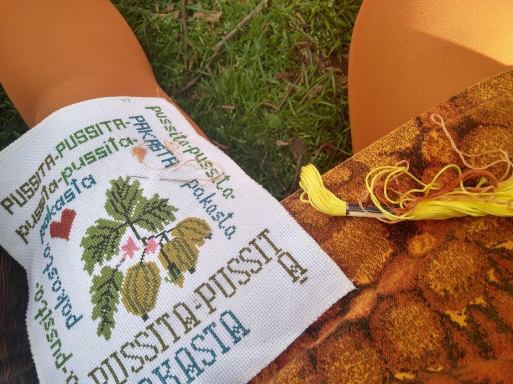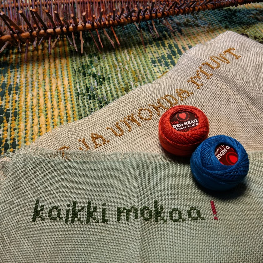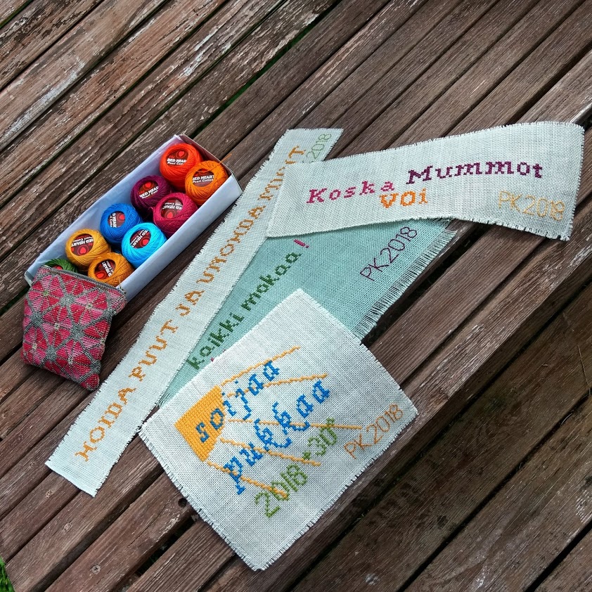 Koskaan ei pitäisi sanoa ”ei koskaan enää”. Ei ainakaan ristipistoista, joiden tekemisen ajattelin 70-80-lukujen taitteessa riittävän ajatuksella ”Nyt on mun ristipistot pistelty, tämä oli tässä ja nyt on aika siirtyä eteenpäin.” Niin siirryinkin ja paljon on tekemisiä ja tapahtumia virrannut elämässä, kunnes noin kaksi vuotta sitten eli heinäkuussa 2018 ristipistot alkoivat viedä mukanaan ihan uusin ajatuksin. Lähdin mukaan Hämeenlinnan radikaalien ristipistojen tapaamisiin. Sen jälkeen on tullut pisteltyä aika monta tekstiä. Ehkä jonkinlaisia heikkoja signaaleja oli jo kesällä 2016, kun ostin Tallinnan tuliaisina laatikollisen erivärisiä helmilankakeriä ilman mitään ajatusta niiden käytöstä. Värit olivat kauniita ja hinta sopiva.