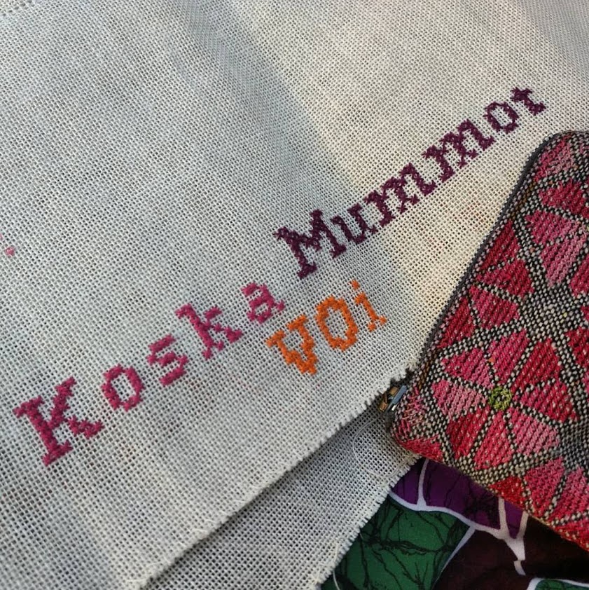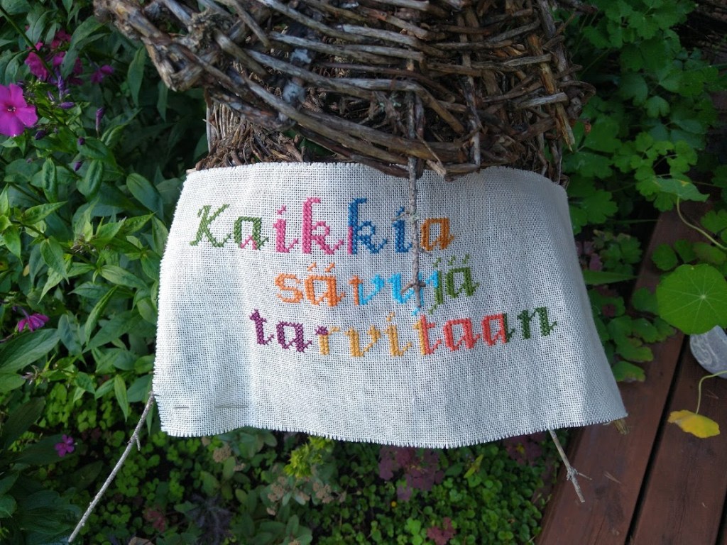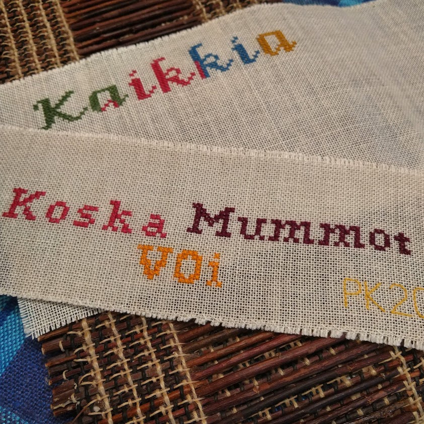 Marttojen M-on vanhassa Marttahuivissa ja yksi nimmari tuttinauhassa. Muutoin tekstit ovat vielä ilman lopullista sijoituskohdetta ja se vähän mietityttää. Mielestäni kaikella tekemisellä pitäisi olla myös käyttötarkoitus, vaikka suunnittelun ja tekemisen prosessi ovat hyvin merkityksellisiä ja hyvinvoinnin kannalta tärkeitä.
