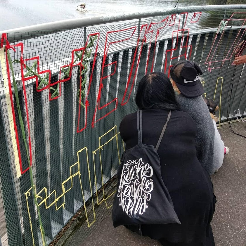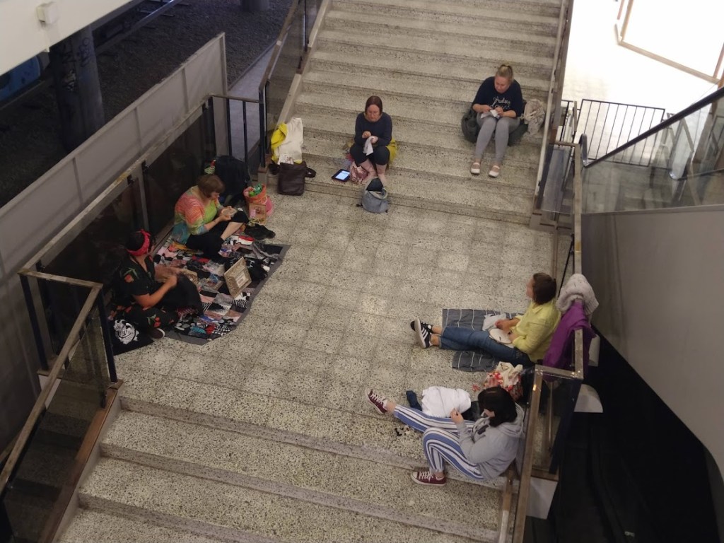 Seuraavat pistelyt ovat lauantaina 8.8.2020 klo 12-15 Ystävyyden puistossa ja perjantaina 28.8.2020 Taiteiden yössä 18.00 alkaen Kortteli2:ssa. Mukaan voi tulla matalalla kynnyksellä tai ihan ilman kynnystä, katselemaan, juttelemaan tai pistelemään. Syksyllä 2018 taiteiden yössä pisteltiin yhteisöllisesti ja isosti matonkuteilla sillankaiteeseen tekstiä: Meitä olisi moneen junaan. Tuolloin oli ajankohtaista pikajunien pysähtyminen Hämeenlinnassa ja pendelöinnin onnistuminen Helsingin ja Tampereen suuntiin.