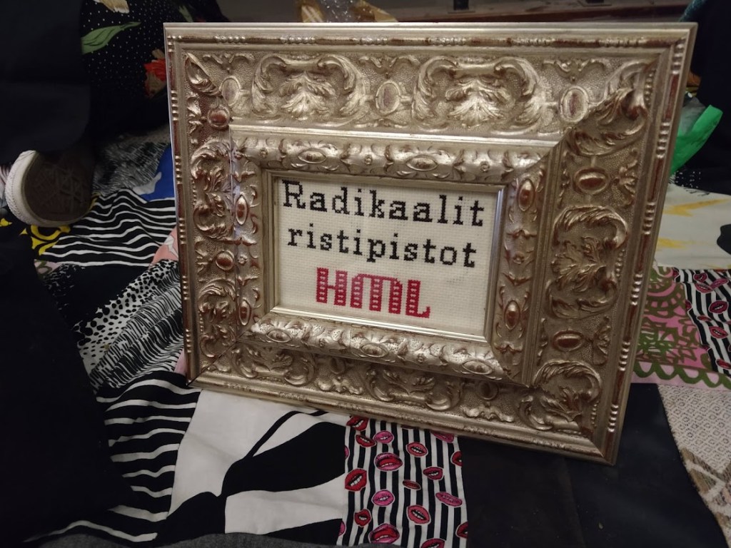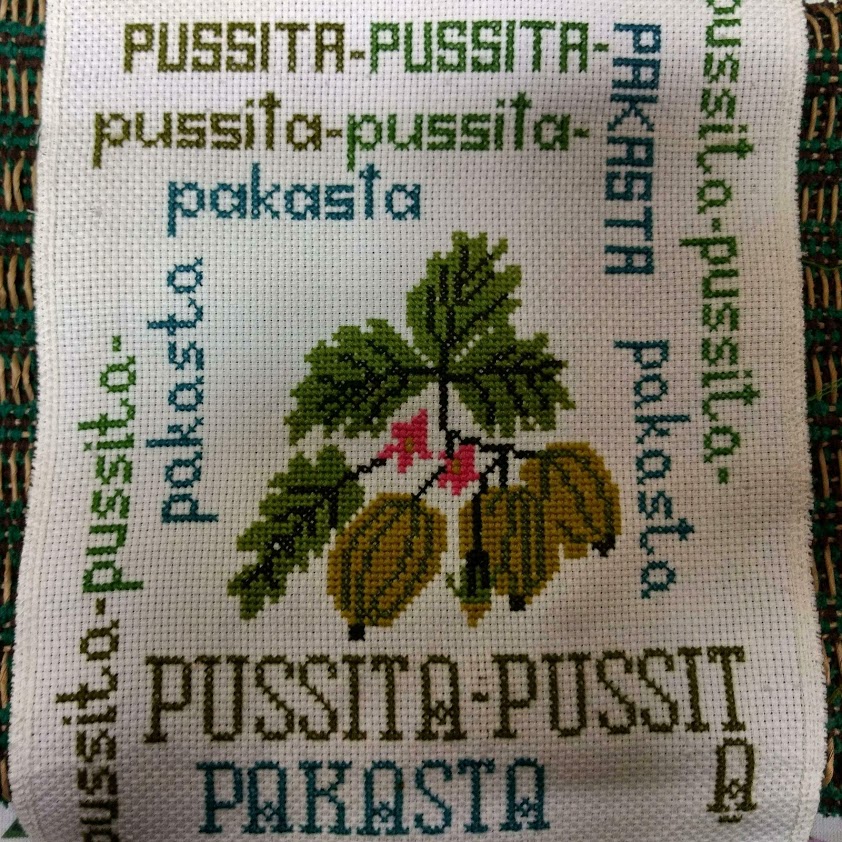 Tässä postauksessa on kuvia Hämeenlinnan radikaaleissa ristipistoissa syntyneistä pistelyistäni, niiden innoittamana tai ajankohtaisista asioista muutoin syntyneitä ristipistotekstejäni. Kuvissa vilahteleva kukallinen pieni ristipistopussi on 70-80 luvun vaihteen pistelyitäni. Karviaisia ja viinimarjoja sisältävät pistelyt ovat kirppislöytöjä, pienia tauluja, joissa marjat olivat kehyksissä. Purin ne auki ja lisäsit pakastus- ja pysy kotona -tekstit.