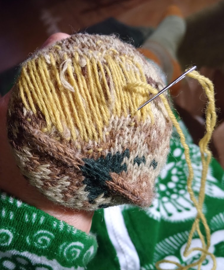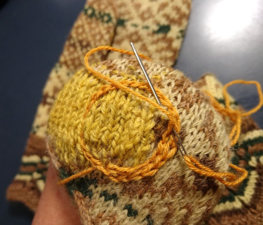 Ison reiän halusin korjata silmukoiden, sillä se on joustavampi paikkaus kuin ristikkoparsittu. Ammottavaan reikään tarvitaan silmukoimista varten toiseen suuntaan tukilangat, joiden ympärille silmukointi tehdään kerros kerrokselta. Tämä vaatii keskittymistä ja silmukan rakenteen mielessä pitämistä kirkkaana. Silmukointi on paljon helpompaa neulepintaan, joka ei ole kulunut vielä kokonaan puhki.