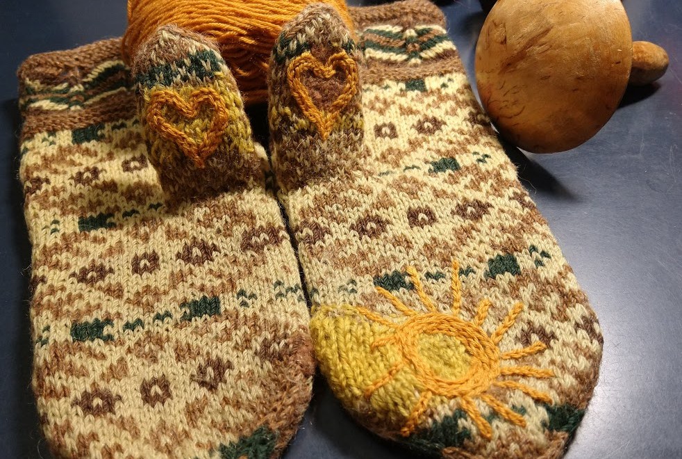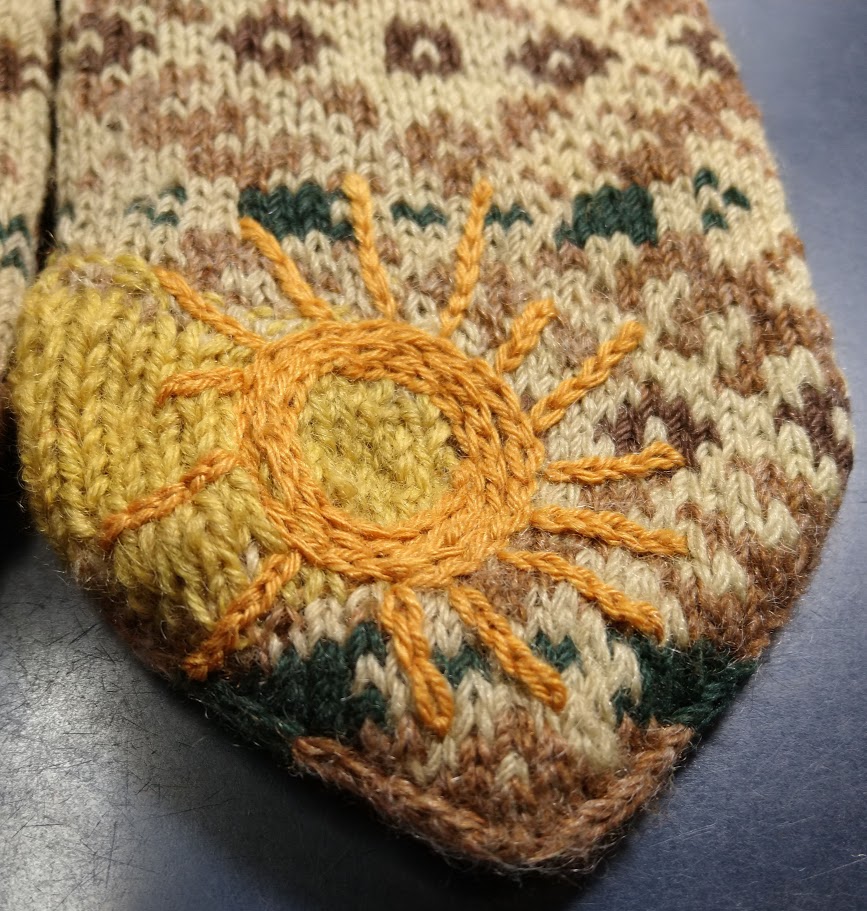 Silti jäin kaipaamaan jotain. Valitsin leijonankeltaista lankaa ja kirjoin ketjusilmukkapistoin auringon kämmeneen ja sydämet kumpaankin peukaloon.