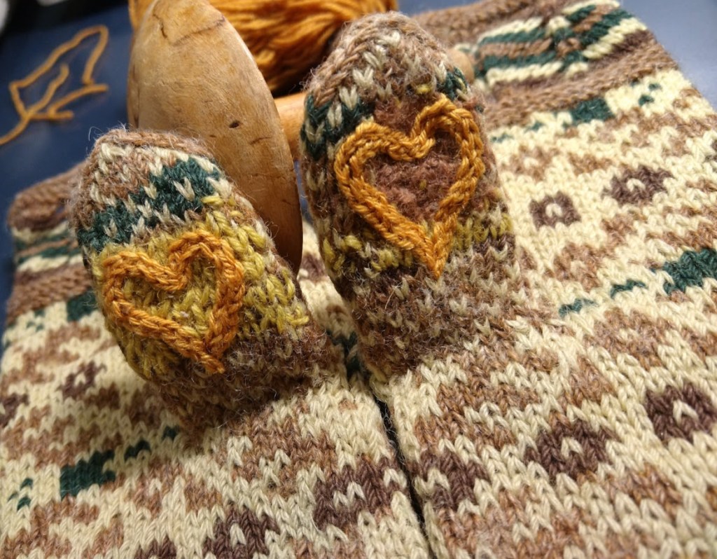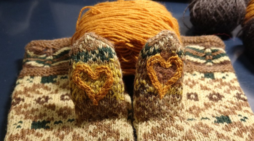 Kämmenen silmukoinnista tuli ihan siisti. Samoin toisen peukalon silmukoinnista. Toisen peukalon ruskea parsimus on vanha, parin vuoden takainen ristikkoparsinta.