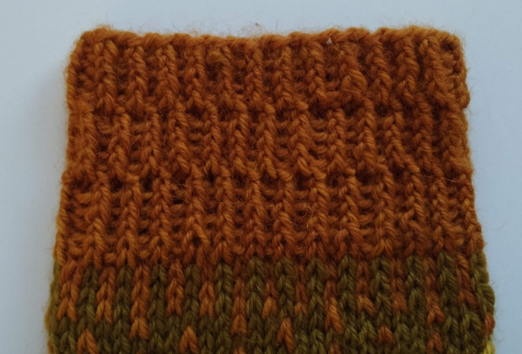 Itselleni tämä oli testi, että noudatanko ohjetta alusta loppuun. Ohjeen mukaan mentiin. Ainoastaan, johtuen tummanvihreän värin määrästä, otin yhden värin lisää kantapäähän ja sitä seuraaviin jalkaterän kiilakavennuksiin. Loppuosan jalkäterän kirjoneuleesta tein taas käyttäen samaa tummaa vihreää kuin sukan varressakin, koska vaaleanvihreässä kirjoneule oranssin värin kanssa erottui vähän heikosti.