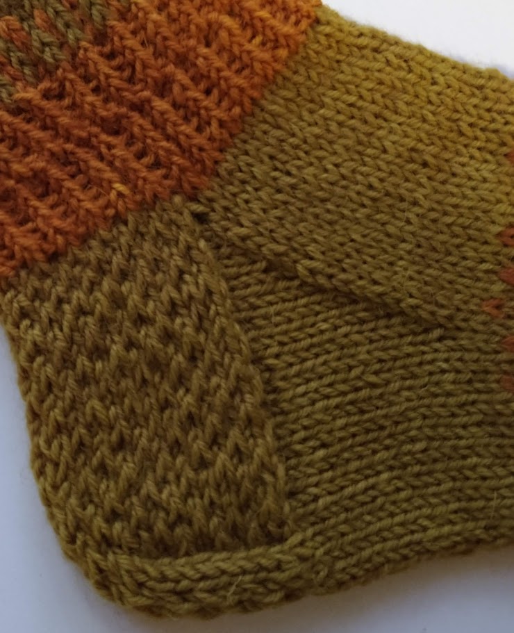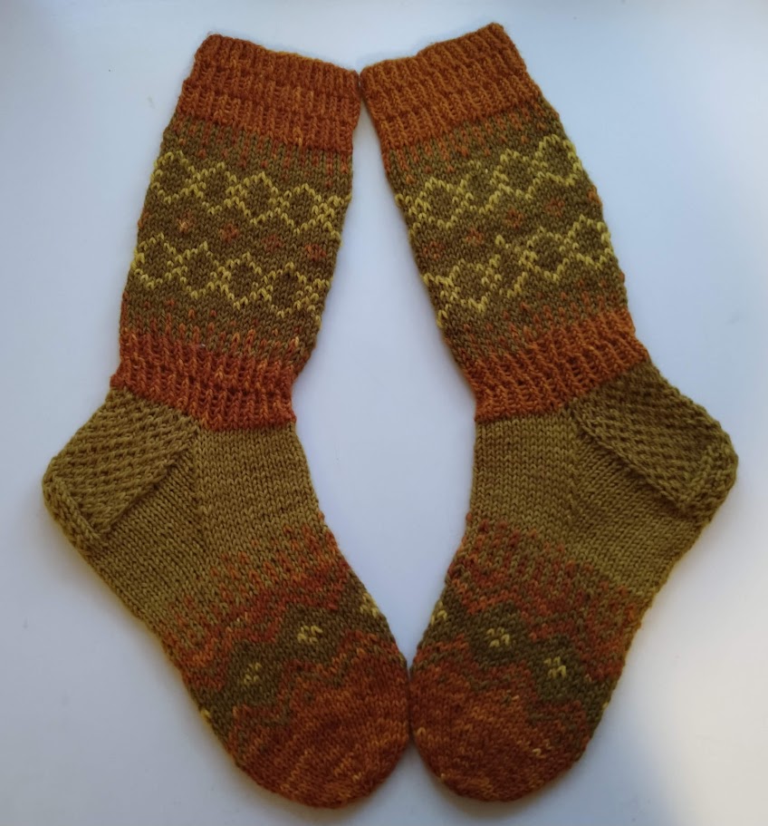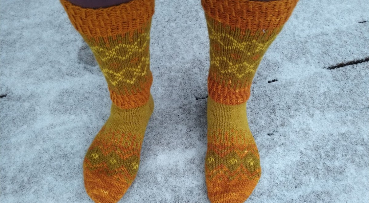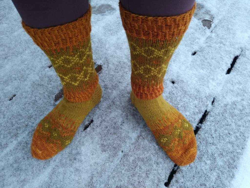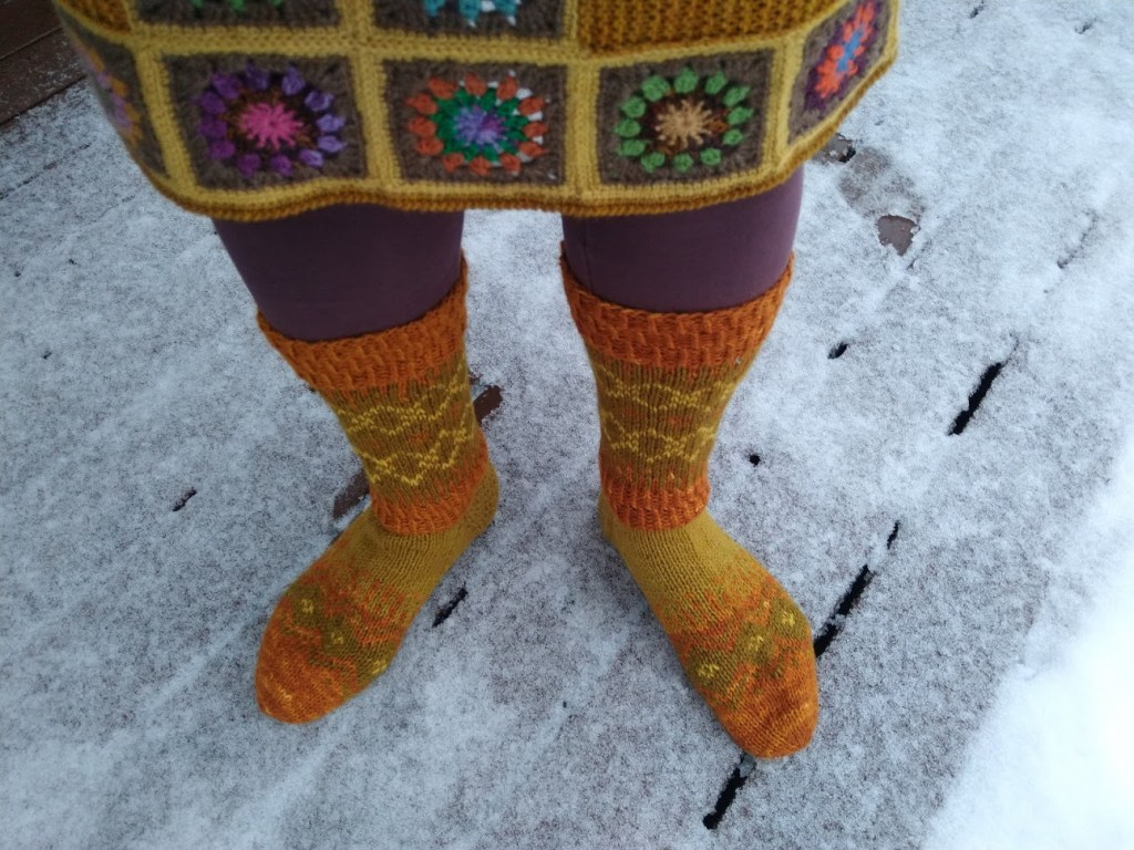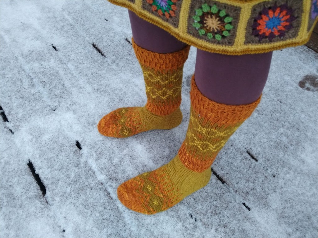 Neuloin Talvenvirtaa -sukat luonnonväreillä värjätyillä 7-veljestä langoilla. Melkein kaikki värit on saatu sipulinkuorista: tumma oranssi keltasipulinkuorista, kirkas keltainen keltasipulinkuoren jälkiväristä, tumma vihreä punasipulinkuorista. Vaaleamman vihreän värin lähdettä en muista varmaksi, saattaa olla punasipulinkuorien jälkiväriä. Käytin 3,5 numeron Knit Pron kantikkaita Cubics -sukkapuikkoja.