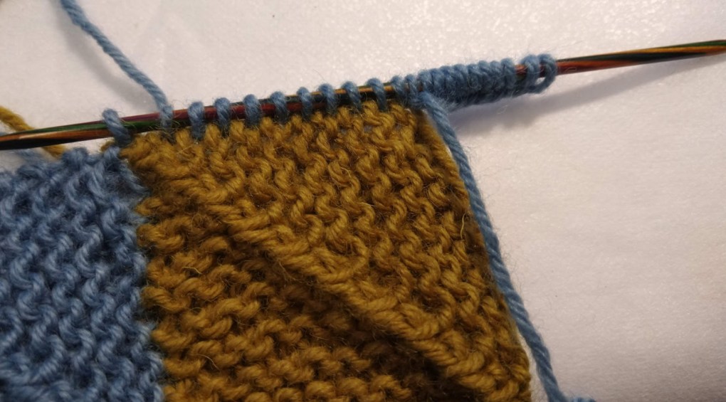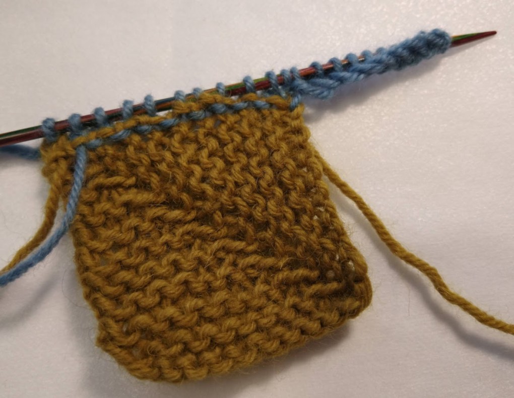 Poimi puikolla olevan edellisen ruudun viimeisen silmukan lisäksi valmiin ruudun vasemmasta kyljestä uuden ruudun langalla 10 silmukkaa ja luo 10 uutta silmukkaa. Käännä ja neulo ohjeen mukaan ruutu valmiiksi.