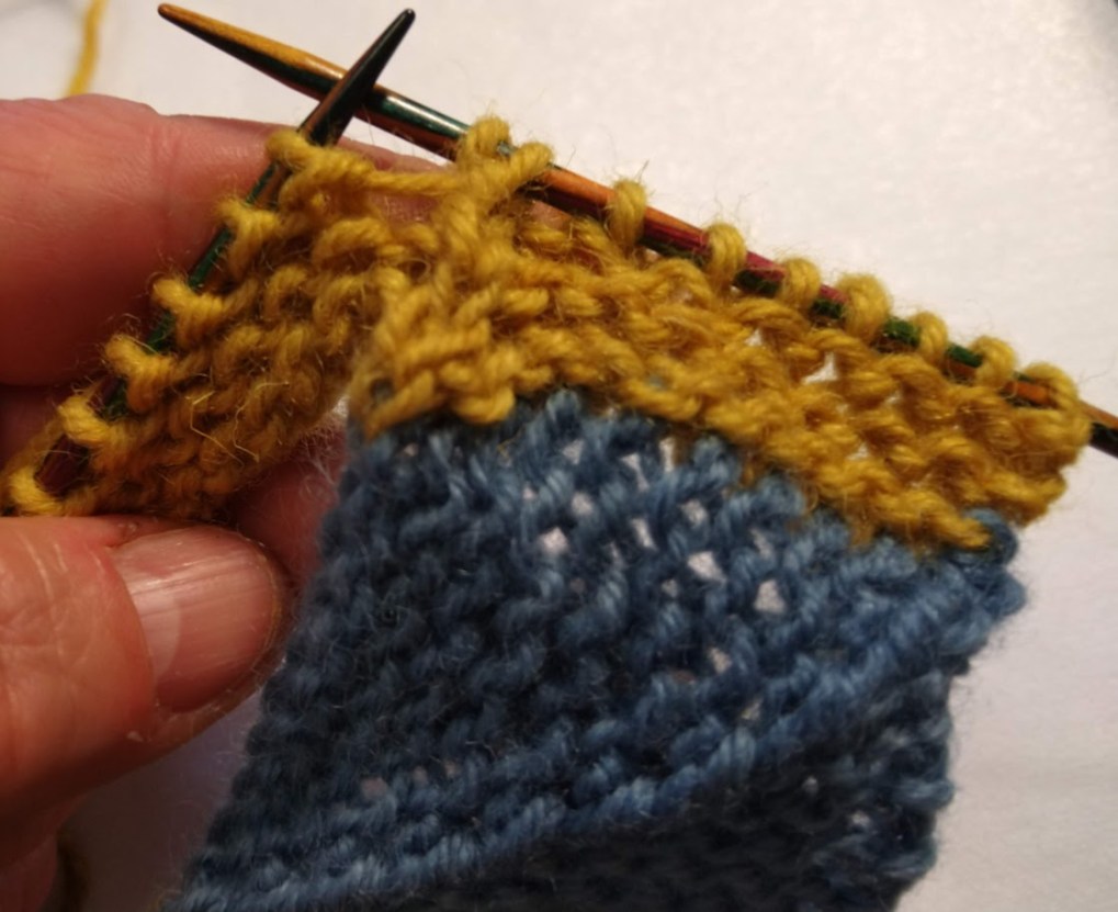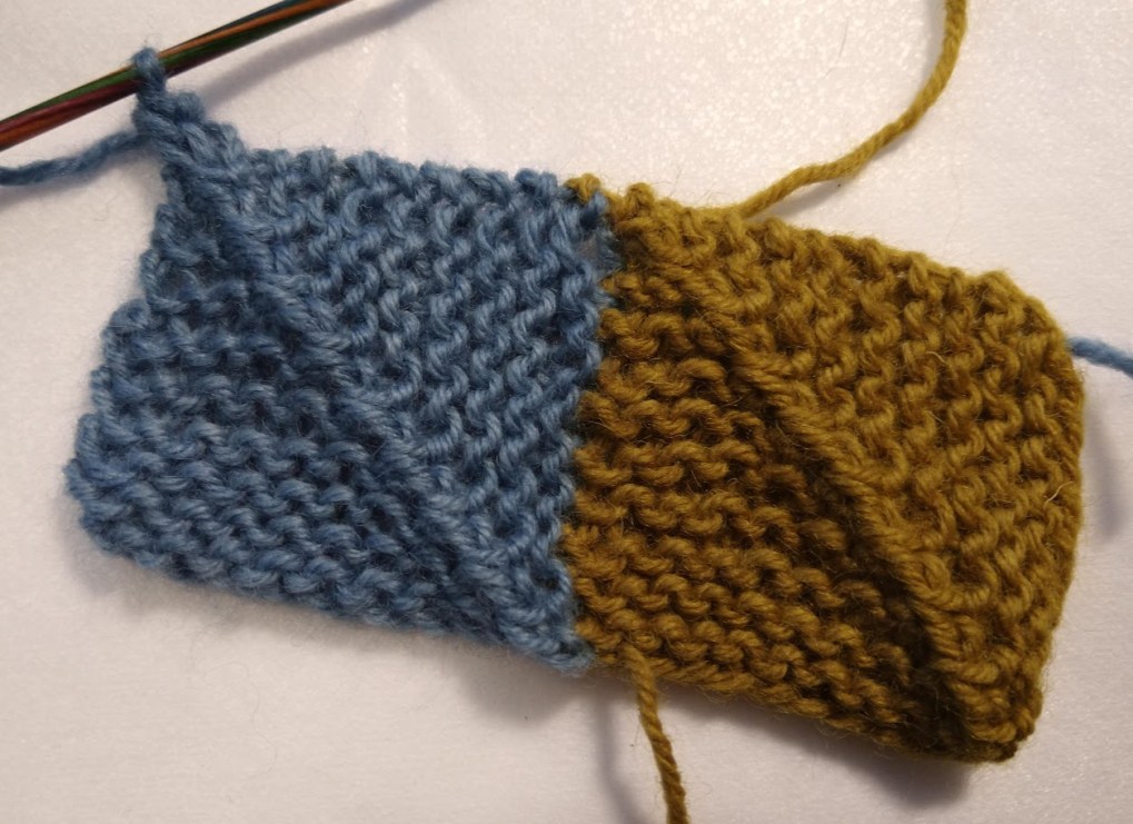 Tämä on neulottu muutoin samalla tavalla, mutta oikea puolen kavennus on tehty seuraavasti: nosta 2 silmukkaa oikein puikolle, neulo kolmas silmukka oikein ja nosta nostetut silmukat neulotun yli.