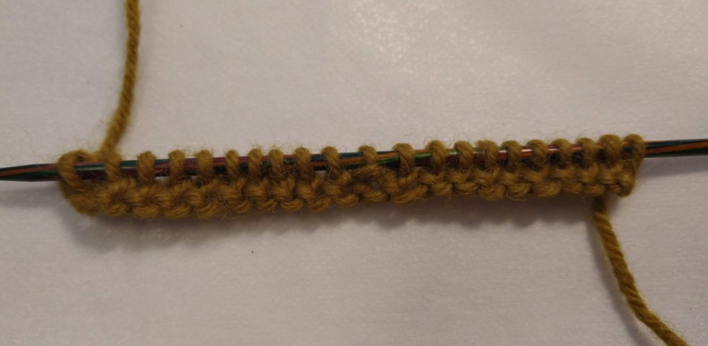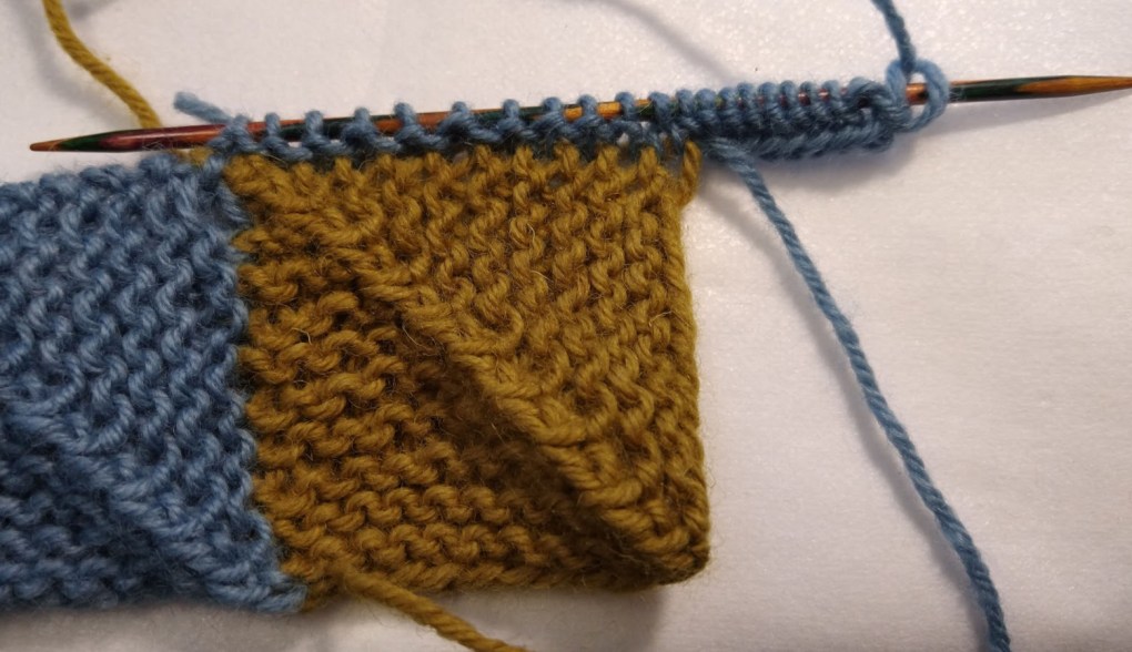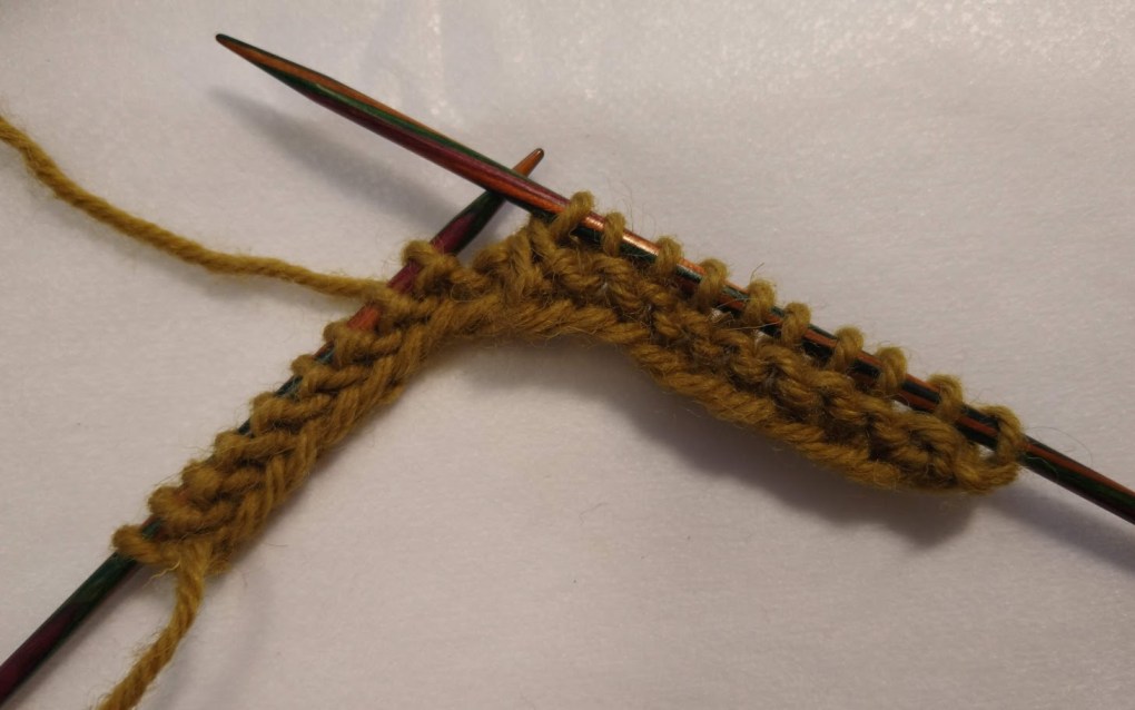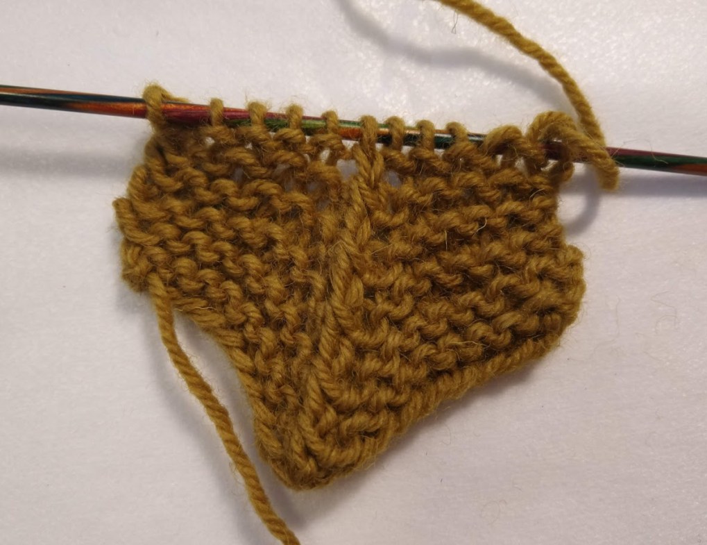 2.Kerros: Neulo oikein, kunnes vastassa on viimeinen silmukka ennen keskimmäistä silmukkaa. Neulo kolme silmukkaa takareunoistaa oikein yhteen. Neulo oikein loppuun kerros. Käännä työ.