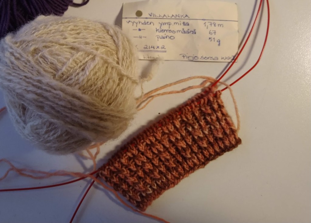 Toinen spesiaali lanka oli vuonna 1978 kehräämäni villalanka. Ensimmäinen kehruuni ikinä ja tapahtui Wetterhoffilla ensimmäisellä kudonnan opintojen vuosikurssilla. 43 vuotta oli riittävä aika hillota tätä lankaa. Huomaa kuvasta, että 2-säikeiselle langalle olen laskenut tex-numeron kehruun ja kertauksen jälkeen.