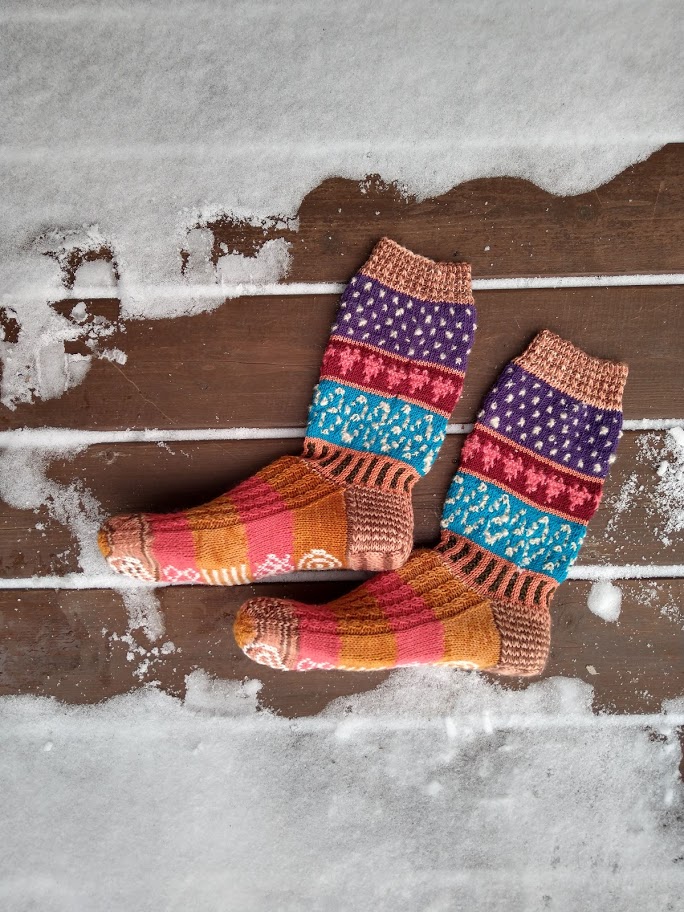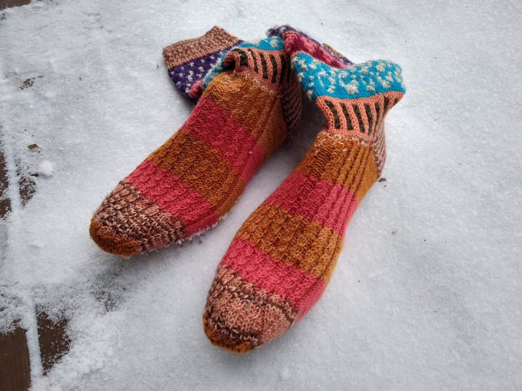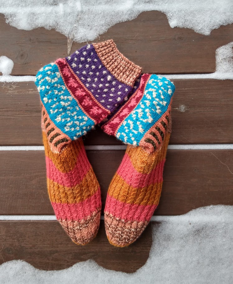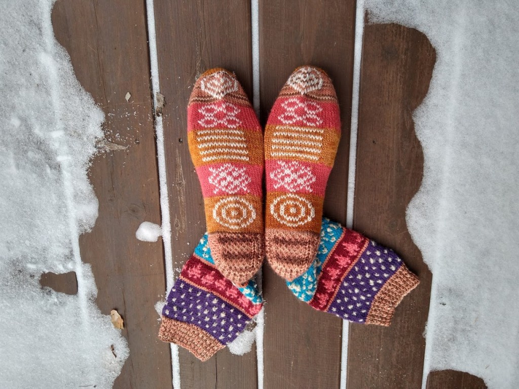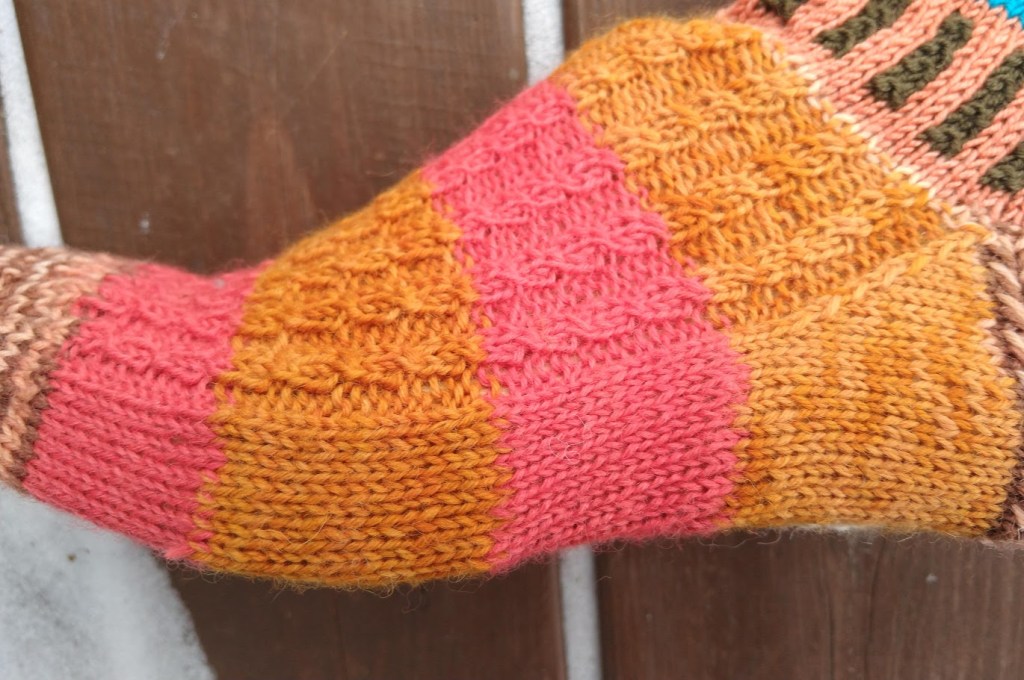 sama kuvio seuraavalle kerrokselle nurjin silmukoin. Näin kuvioihin tuli kolmiulotteisuutta. Lisäksi päätin, että väritys ei ole ihan tyypillisin minulle. Tämä väriajatus ei kylläkään ihan toteutunut. Käytin pieniä keriä ohuita lankoja. En puhu jämälangoista, vaan erikokoisista keristä, sillä usein myös värjään muutaman kymmenen gramman erissä lankoja. Ei niitä voi sanoa jämiksi. Neuloin molemmat sukat yhtäaikaa looppaamalla 2,25 numeron pyöröpuikolla.