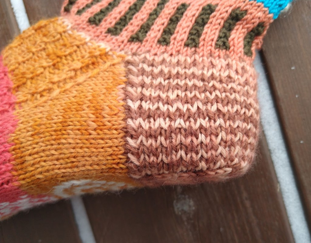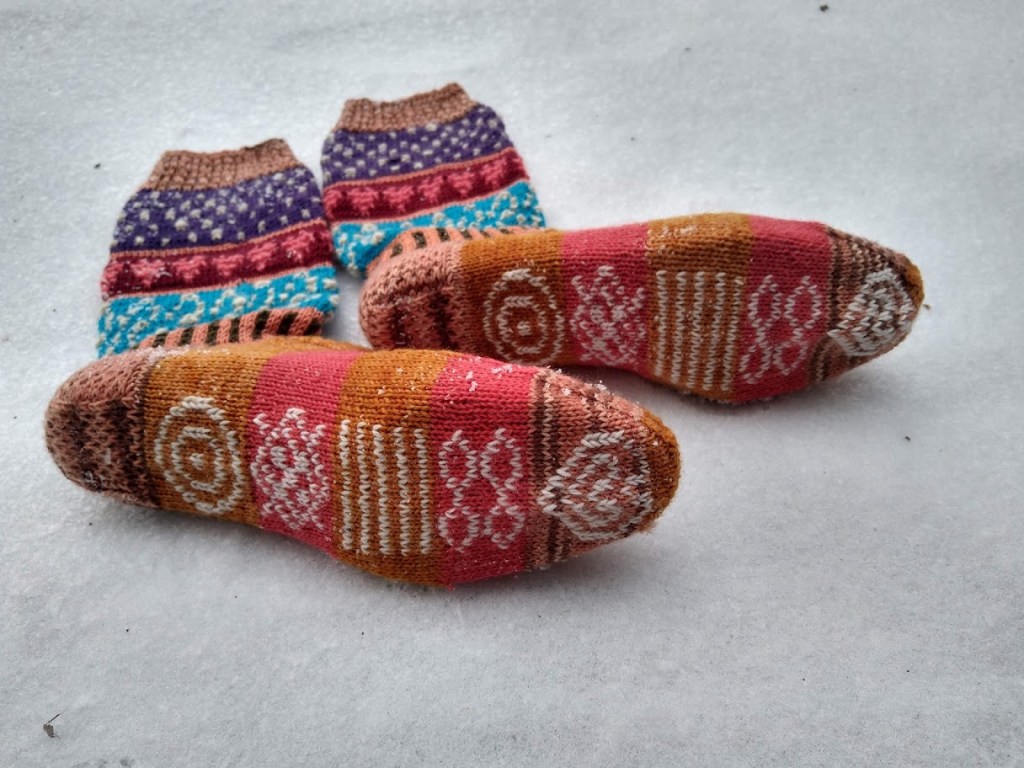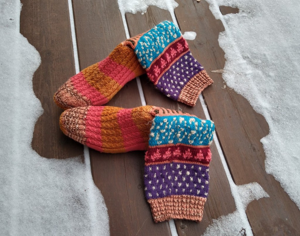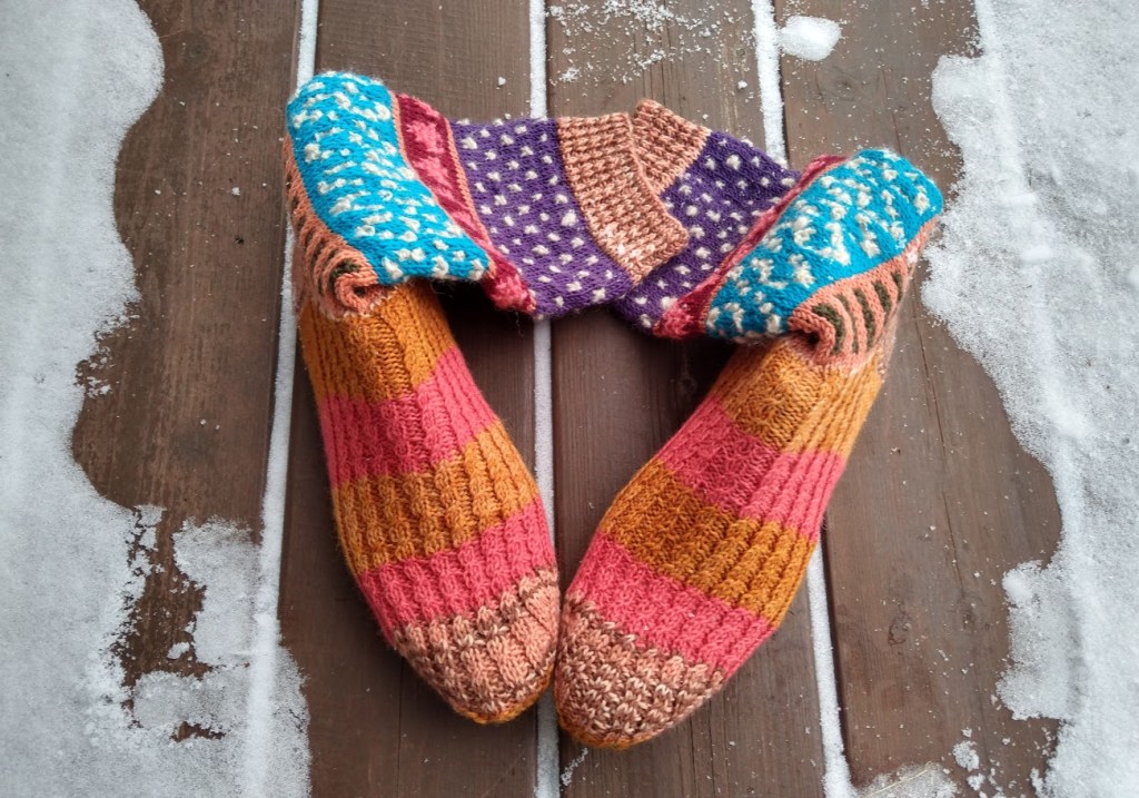 sama kuvio seuraavalle kerrokselle nurjin silmukoin. Näin kuvioihin tuli kolmiulotteisuutta. Lisäksi päätin, että väritys ei ole ihan tyypillisin minulle. Tämä väriajatus ei kylläkään ihan toteutunut. Käytin pieniä keriä ohuita lankoja. En puhu jämälangoista, vaan erikokoisista keristä, sillä usein myös värjään muutaman kymmenen gramman erissä lankoja. Ei niitä voi sanoa jämiksi. Neuloin molemmat sukat yhtäaikaa looppaamalla 2,25 numeron pyöröpuikolla.