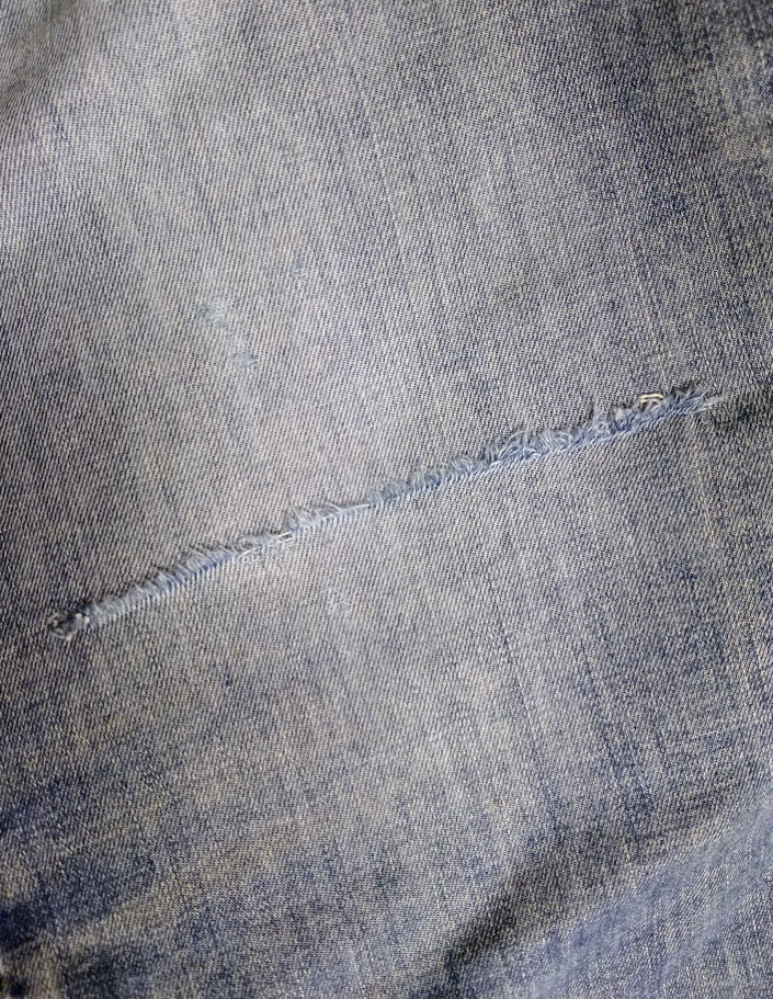 - Leikkasin vastaavasta joustavasta kierrätetystä farkkukankaasta riittävän ison palan risan ja hiutuneen alueen alle.