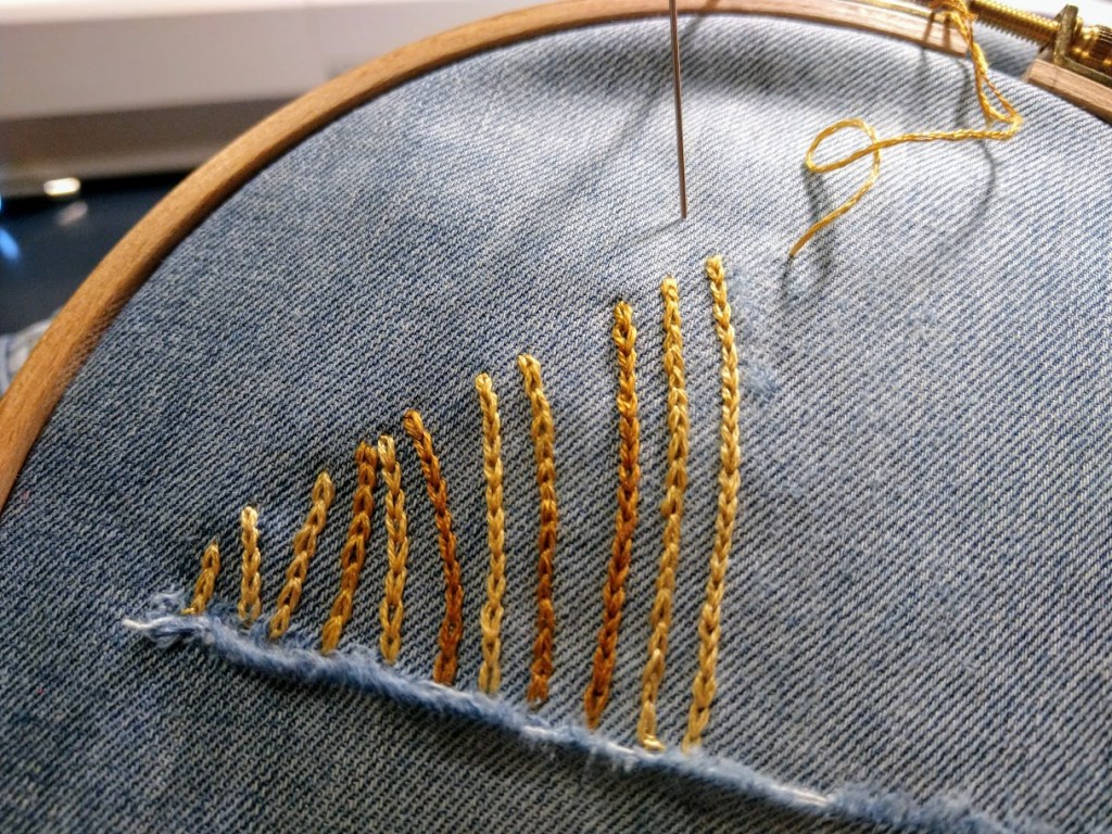 - Kirjoin liukuvärjätyn muliinilangan kolmella säikeellä ketjupistokaaria revenneestä alueesta ylöspäin. Muliinilanka oli siis jaettuna kahteen osaan.