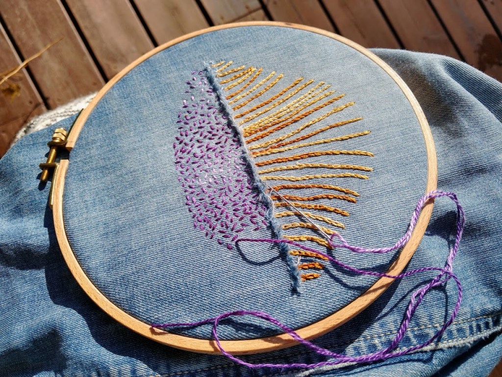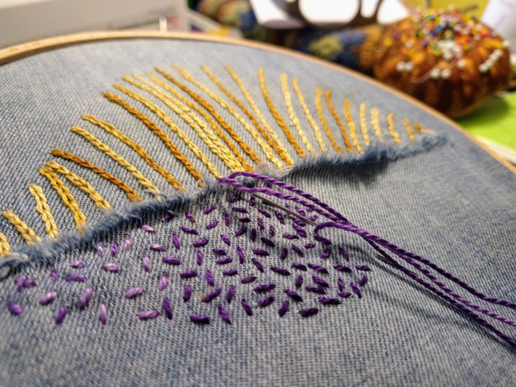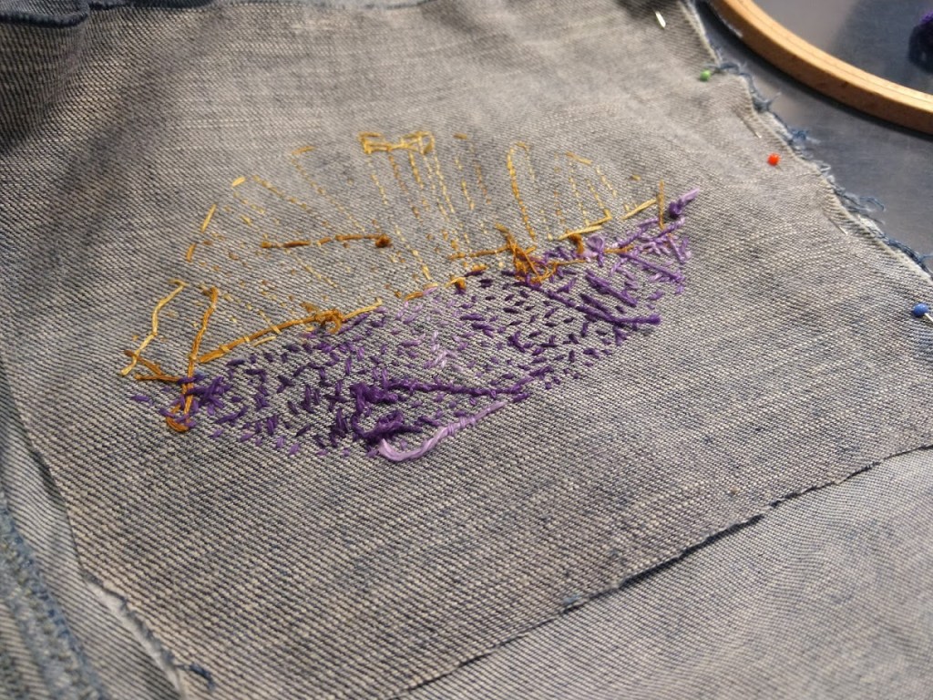 Liukuvärjätty lanka sopi mielestäni tähän korjauskirjontaan hyvin, sillä se toi elävyyttä sekä yläpuolen auringonlaskua /viljapeltoa ja alapuolen lampea/varjoja kuvaavaan korjaukseen. Ketjupistot ovat helppoudessaan suosikkejani kirjontapistoista, mutta etenkin sikin-sokin tikkipistojen tekeminen oli oikein innostavaa, kun sai huiskia pistoja ihan miten vaan. Tätä olisin voinut jatkaa vaikka kuinka kauan. Jätin tarkoituksella revenneen risareunan ylä- ja alakorjausten väliin, sillä uskon korjauksen kestävän alla olevien vahvojen farkku- ja liimakankaiden ansiosta.