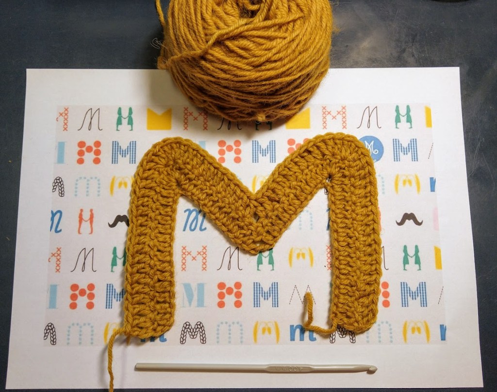 - Tee 67 ketjusilmukkaa (20+1+10+3+10+1+20+2) pitkäjalkaisiin M-kirjaimiin (korkeus 12 cm)