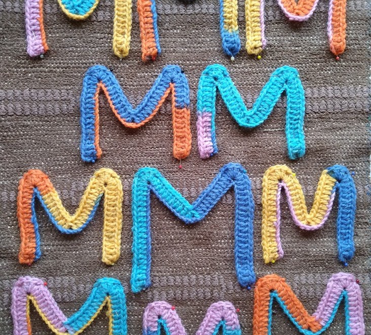 Kun Marttaraitalanka loppui, jatkoin M-kirjainten virkkaamista kirjavalla Nalle-langalla (joku vanha keränloppu) virkkuukoukulla numero 3. Laihojen M-kirjainten lisäksi kokeilin M:n lihavointia virkkaamalla toisen kerroksen pylväitä.