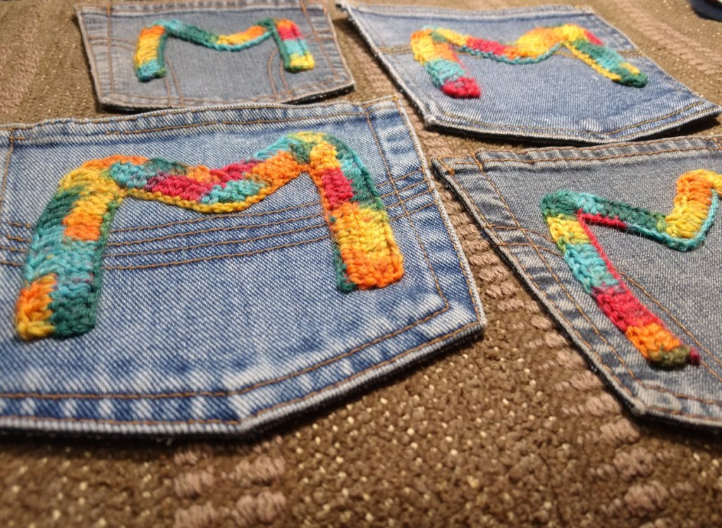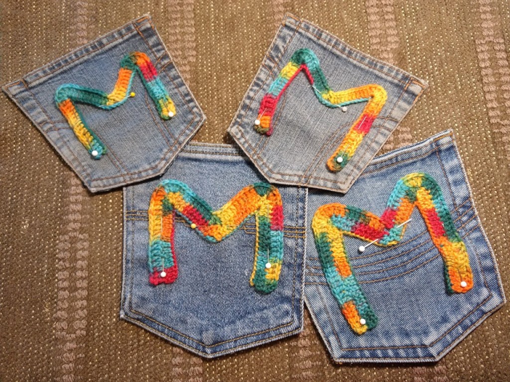 Minun Marttalanka M:t jäävät toistaiseksi kiinni vanhaan kudottuun sängynpeitonpalaan. Siitä voisi tulla vaikka Marttapajan seinävaate. Nallelankaiset M:t pääsivät farkkutaskuihin kiinni ja tulevat todennäköisesti käsityökassin kylkiin pientavaroille. Ompelin M.t kiinni helmilankaa vastaavalla kirjontalangalla ja lyhyillä tikkipistoilla (etupistot) kiertäen koko M:n ympäri eli ulko- ja sisäreunasta. Taskuissa on taustakangas, joten piti tarkkailla, ettei ommellut samalla taskua umpeen.