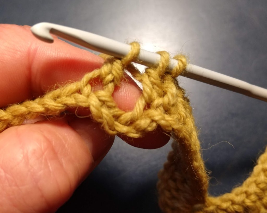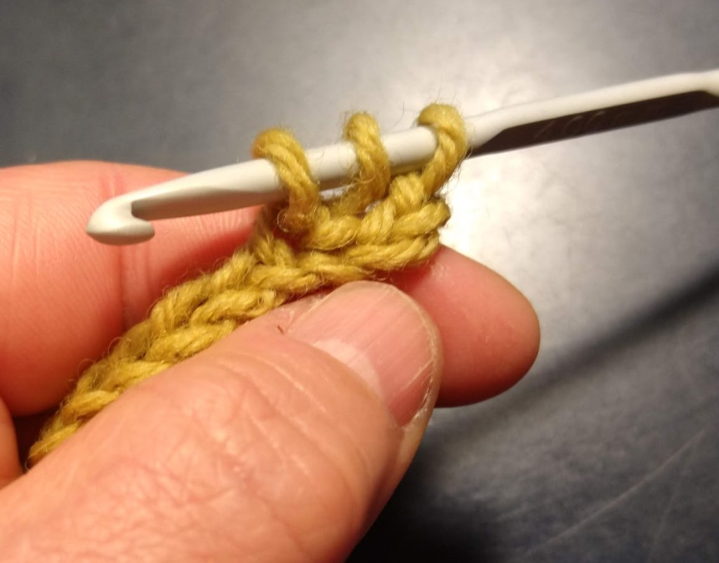 - Virkkaa 3 pylvästä myös seuraavaan silmukkaan (2. kuva alla).