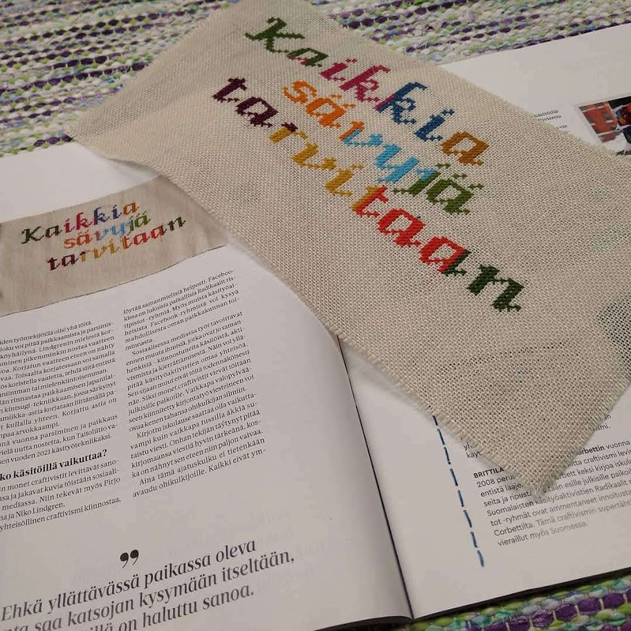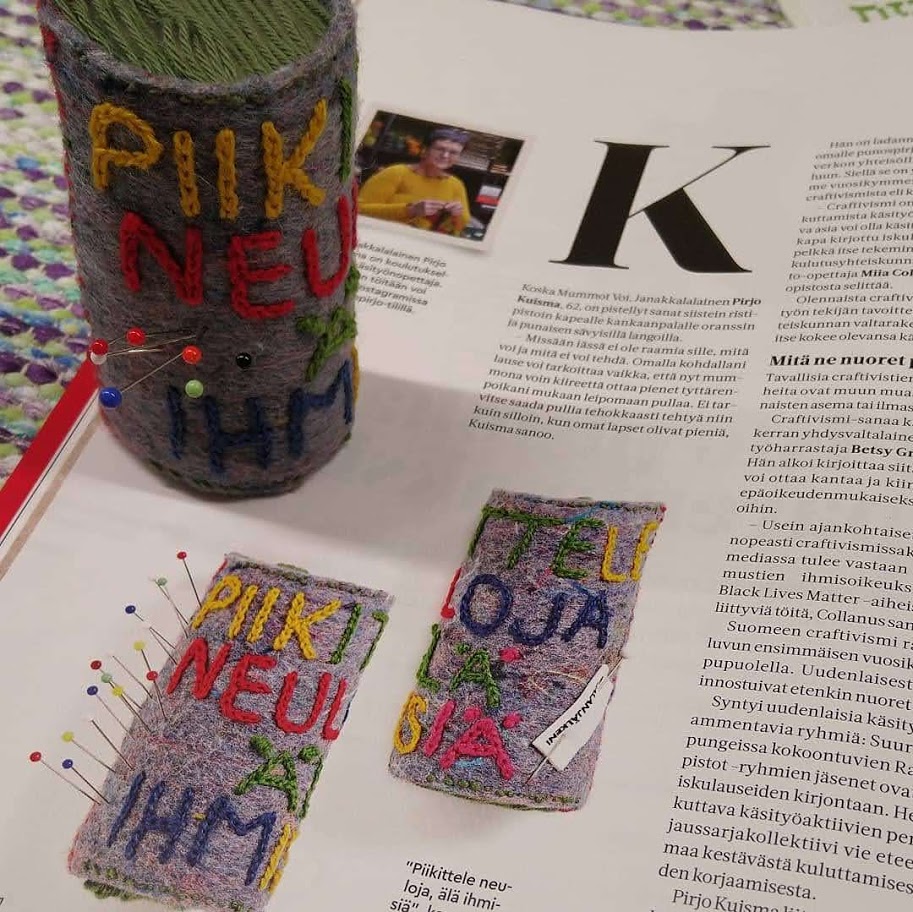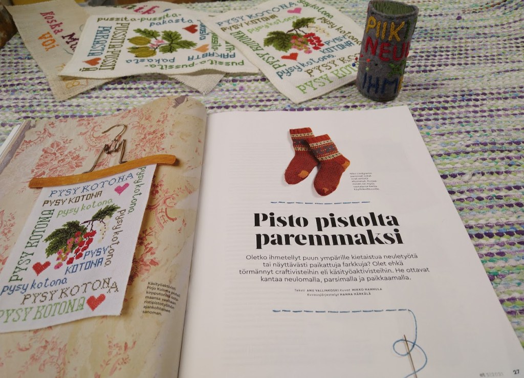 Pysy kotona -teos pääsi maaliskuussa myös ET-lehteen (5/3.3.2021), kun siinä julkaistiin Anu Vallinkosken toimittama artikkeli käsityövaikuttamisesta, graftivismista. Olin toinen artikkeliin haastatelluista käsitöillä kantaaottavista henkilöistä. Minun ensisijaisena aiheena haastattelussa oli radikaalitristipistot. Olen ollut suht säännöllisesti mukana Hämeenlinnan radikaalien ristipistojen kokoontumisissa ja postannut niistä mm Instagramissa @punospirjo– tililläni ja täällä blogissakin. Toinen haastatelluista oli Niko Lindgren, joka paikkaa vaatteitaan näkyvästi ja ottaa siten kantaa vastuullisen kuluttamisen puolesta. Nikoon tutustuminen somen kautta on tuonut myös lukuisia muita paikkaajia Suomesta ja maailmalta omaan some-verkostooni.