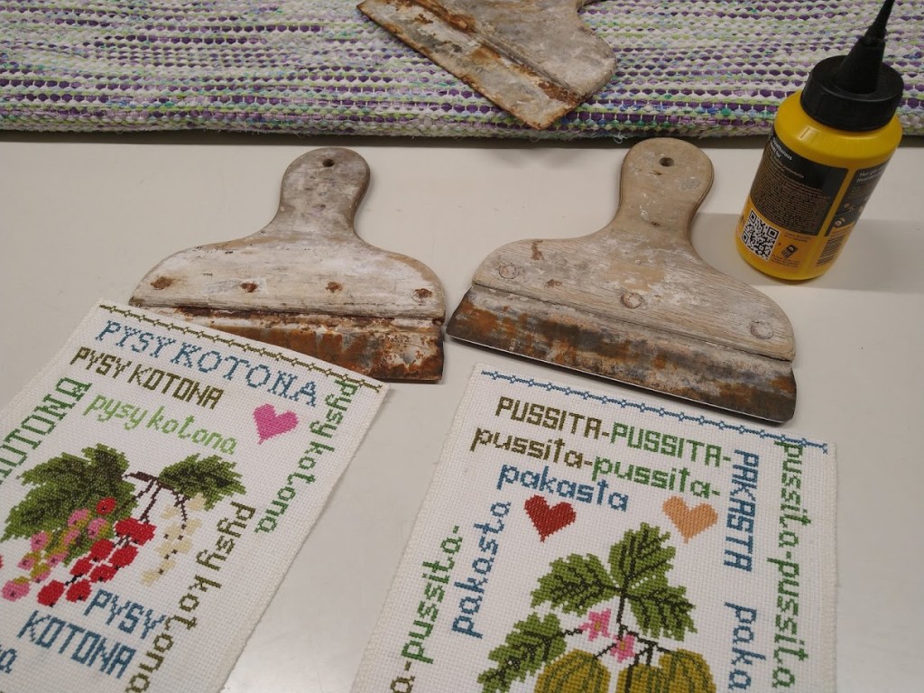 Pysy kotona -pistelyni oli ET-lehdessä ripustettuna hauskasti vanhaan housuhenkariin. Keräsinkin kaapista vapaat, omat vastaavat henkarit ripustuskäyttöä varten. Laitoin kuitenkin Pysy kotona – pistelyni kiinni vanhaan laastilastaan. Olen ostanut nipun noita käytettyjä lastoja kirpparilta, kun ne ovat mielestäni niin kauniita ja mielikuvitusta inspiroivia. Kauniita, kuten kaikki vanhat työkalut, joista näkyy ajan kuluminen ja käytön jäljet. Tekemisen meininkiä.