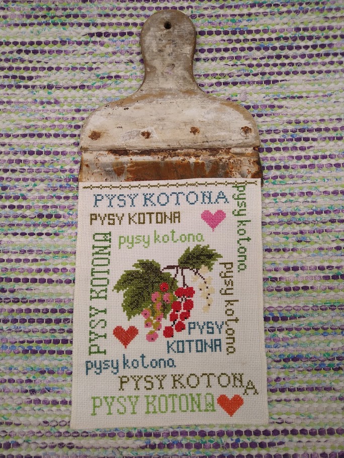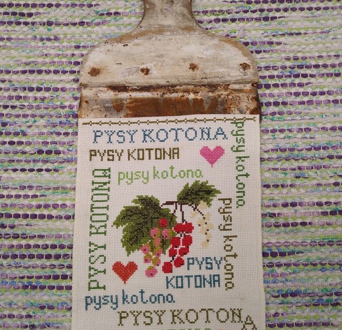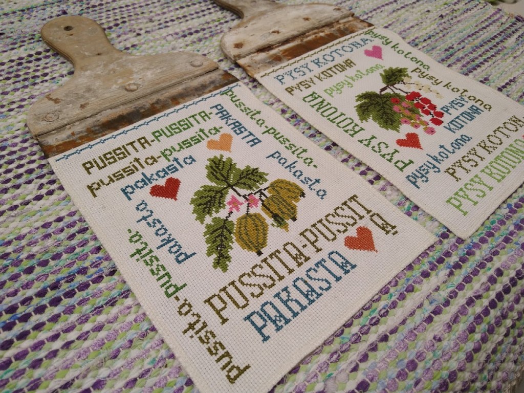 Pistelyn pohjana oli kirppikseltä eurolla ostettu ja atomeiksi purettu viinimarjaterttu -taulu. Tästä olen postannut aiemmassa ristipistopostauksessa.