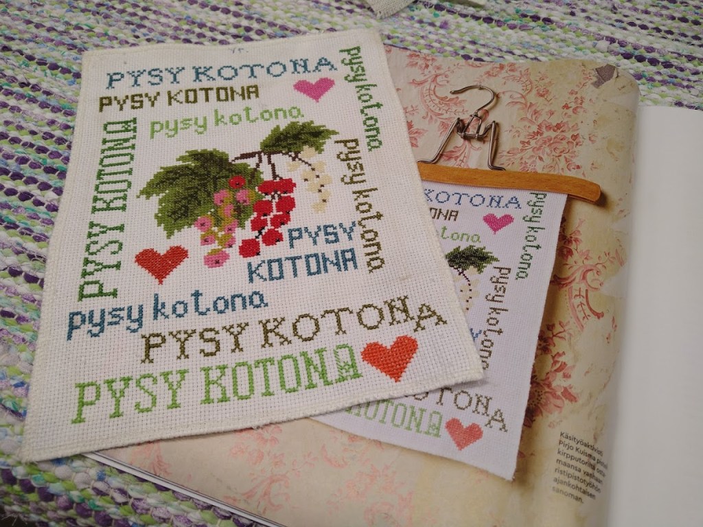 ET-lehteen pääsi myös muutama muu ristipistotyöni, kaikissa oma sanomansa. Neulatyynystä on blogissa myös ihan oma postaus.