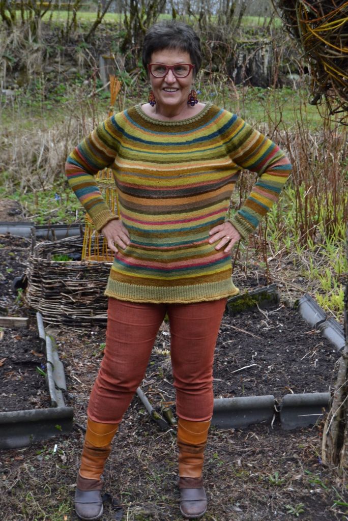 Langoista: kaikki langat ovat villalankoja noin 400 m / 100 grammaa vahvuisia, vähän eri lankalaatuja, Dripsin Fabelia ja sitä vastaavia suurin osa. Kaikki resorit ovat alpakkalankaa. Kaikki värit on luonnonvärejä eli olen ne kaikki kasveilla värjännyt muutakien vuosien aikana. Neuloin puseron 2,5 numeron pyöröpuikoilla ja hihat samankokoisilla sukkapuikoilla. Pusero paivaa 382 grammaa.