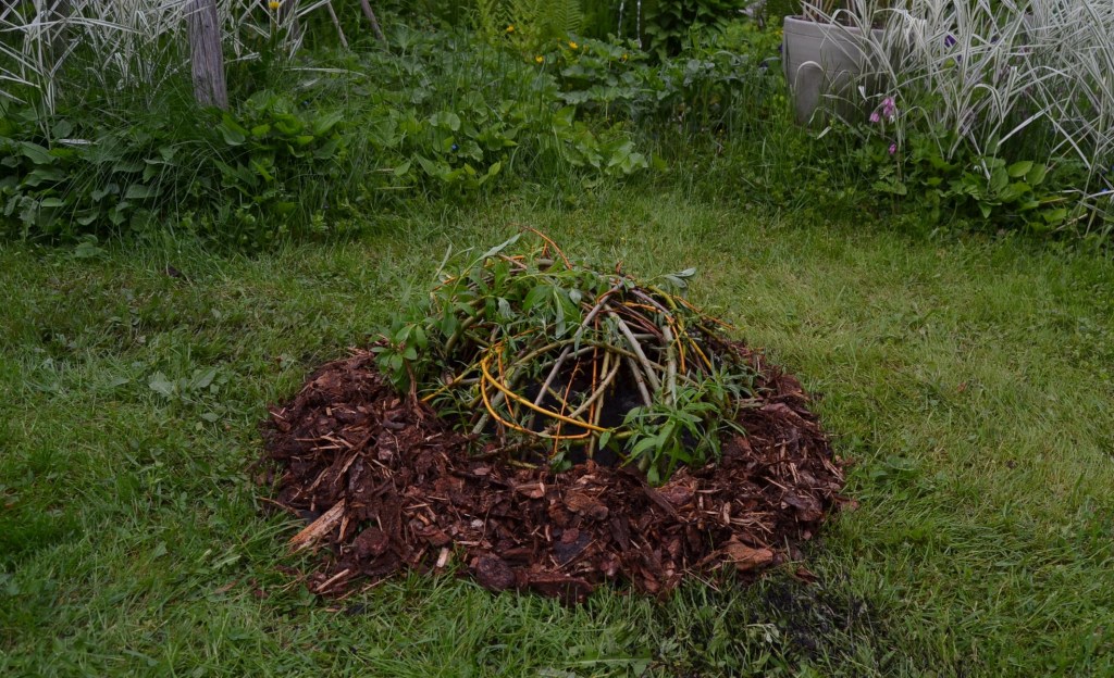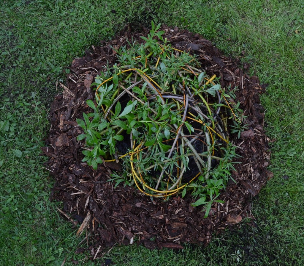 Kun juurien kasvu näyttää hyvältä, on aika istuttaa pajupallo maahan. Kaivan palloa varten kuopan, joka on kauttaaltaan noin 10 cm isompi kupera kuppi kuin pallon halkaisija. Kastelen kuoppa hyvin, laitan pallon kuoppaan ja lisään multaa pallon ympärille ja pallon sisään. Pallosta on siis noin 1/3 maan pinnan alla. Kastelen multaa runsaasti. Lisään kuorikatetta pallon ympärillä olevalle multa-alueelle. Katettua palloa on helpompi kastella runsaasti, kun multa ei pääse valumaan veden mukana karkuun.