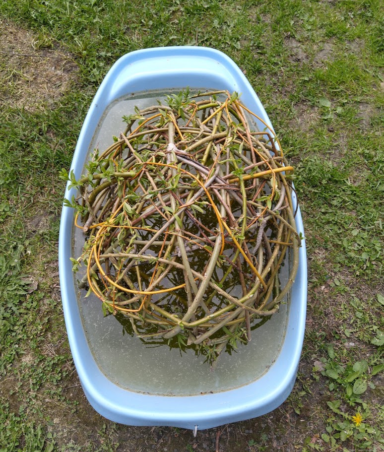 Punottua, kasvavaksi tarkoitettua palloa on hyvä pitää parisen viikkoa vesiastiassa niin, että veden alla on kokonaan se osa, joka jää mullan alle. Eli noin 1/3. Tähän osaan vesiastiassa tulee vähitellen ituja ja sitten juuria. Samaan aikaan myös lehtisilmut pullistuvat ja aukeavat kaikissa vettä tyvestä saavissa piiskoissa. Jo näiden viikkojen aikana alkaa vastaavasti veden yläpuolella olevat pajupiiskat kuivua.