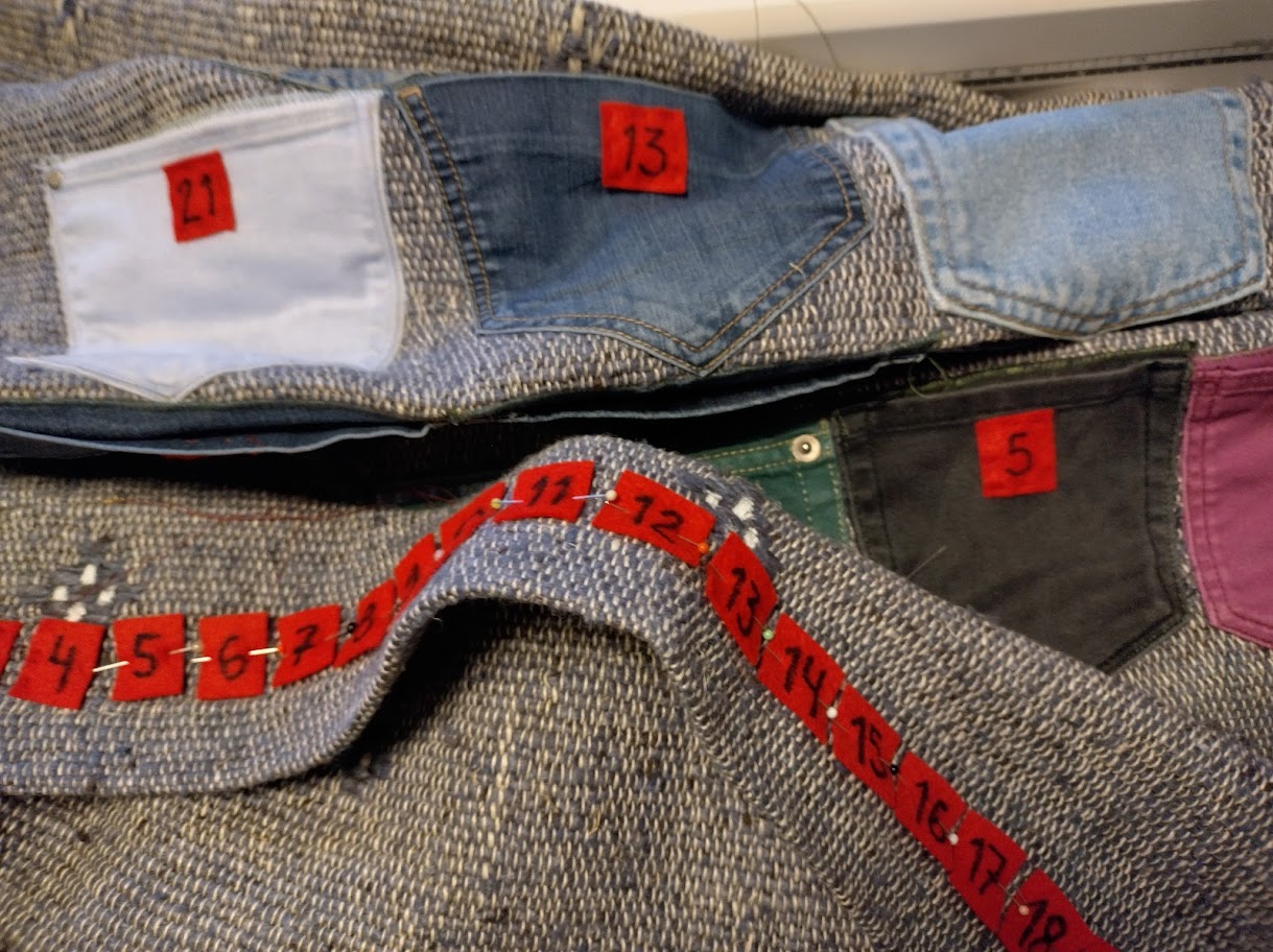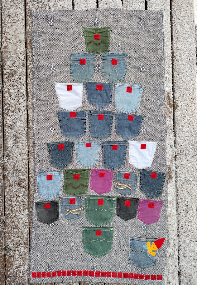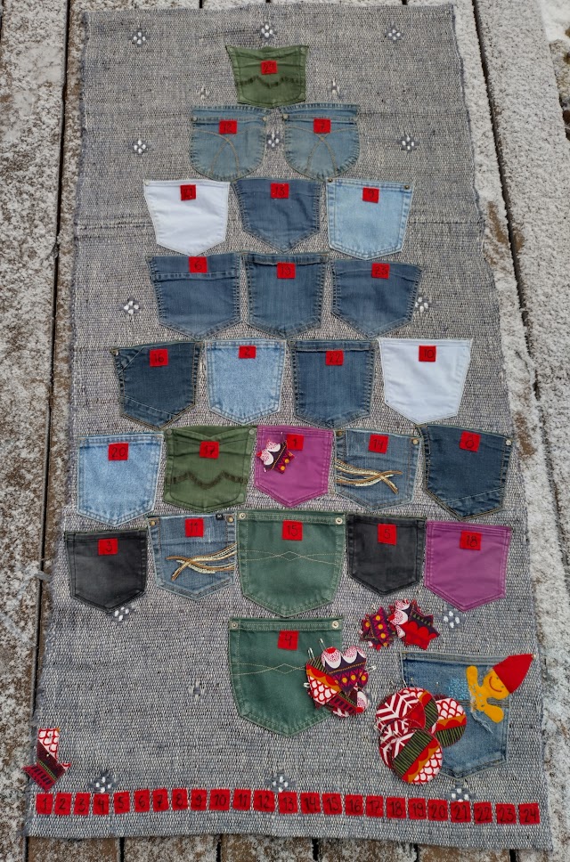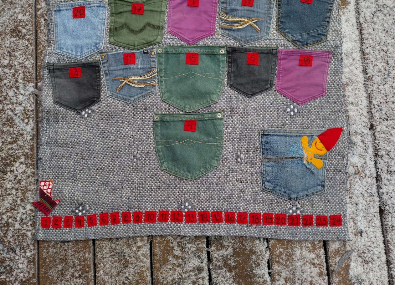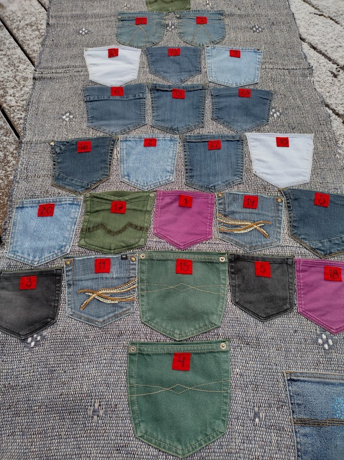 Ompelin pyynnöstä päiväkoti-ikäisille veljeksille kestojoulukalenterin. Kalenterin 24 luukkua ovat käytöstä poistettujen farkkujen takataskuja.