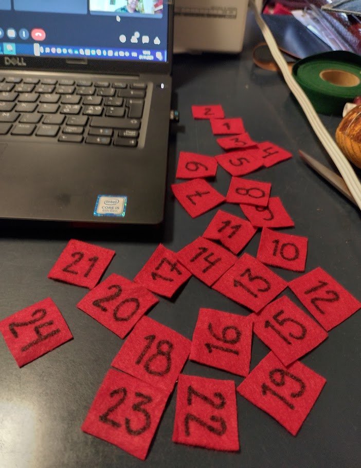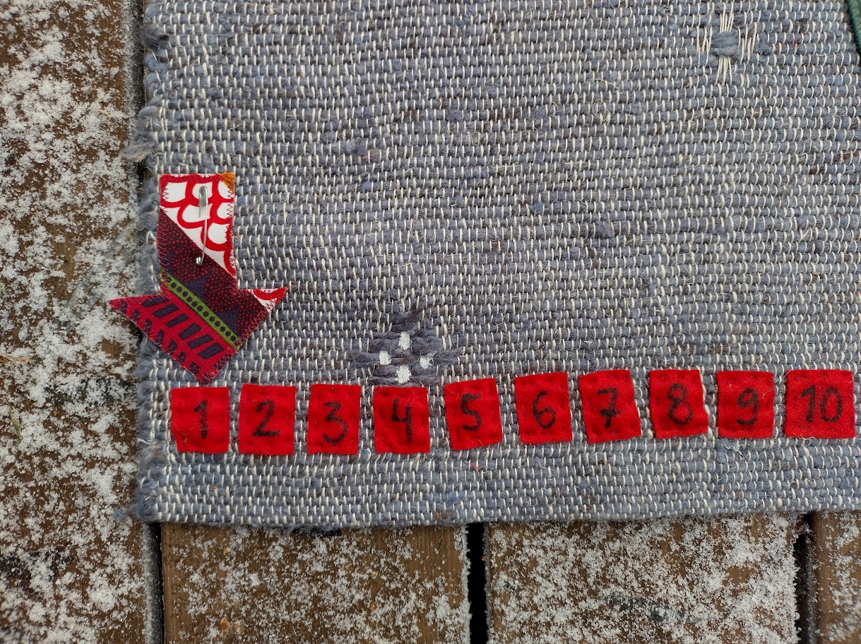 Tein toiset huopanumerolaput ja kiinnitin ne nauhaksi kalenterin alareunaan. Siitä näkee numeroiden järjestyksen 1-24. Numeronauhan vuorossa olevan numeron avulla voi etsiä kuusesta vuorossa olevan taskun. Kankainen nuoli osoittaa vuorossa olevan päivän. Vanhempien tehtävä on siirtää nuolta päivä kerrallaan eteenpäin. Näin saadaan siis numerot 1-24 haltuun. Ainakin eskari-iän lähentyessä.