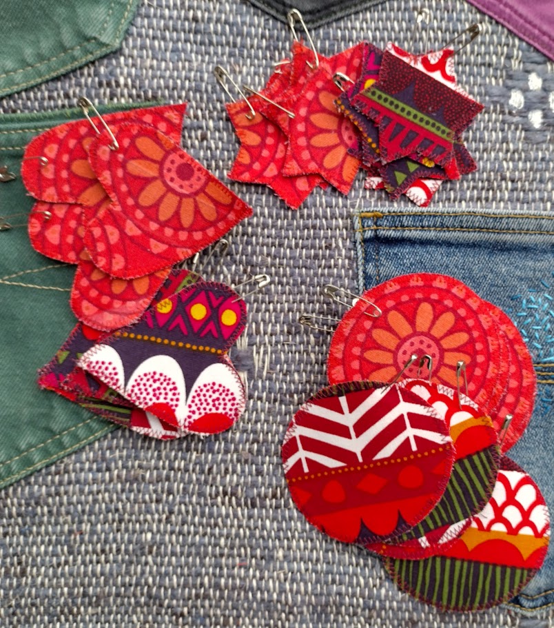 Kiinnitin silittämällä kaksipuoleisella liimakankaalla kaksi painokangasta yhteen. Toinen kangas on Sanna Annukan Marimekolle suunnittelema Raanu-kuosi vuodelta 2011 ja toinen on vanhaa retrokangasta verhokapasta. Leikkasin retrokankaan ympyräkuvioiden mukaan 8 palloa. Lisäksi leikkasin piparkakkumuottien avulla 8 tähteä ja 8 sydäntä. Varmistin kankaiden yhdessä pysymisen vielä kapealla siksakilla kuvioiden reunojen ympäri. Laitoin jokaiseen koristeeseen hakaneulan kiinnitystä varten.