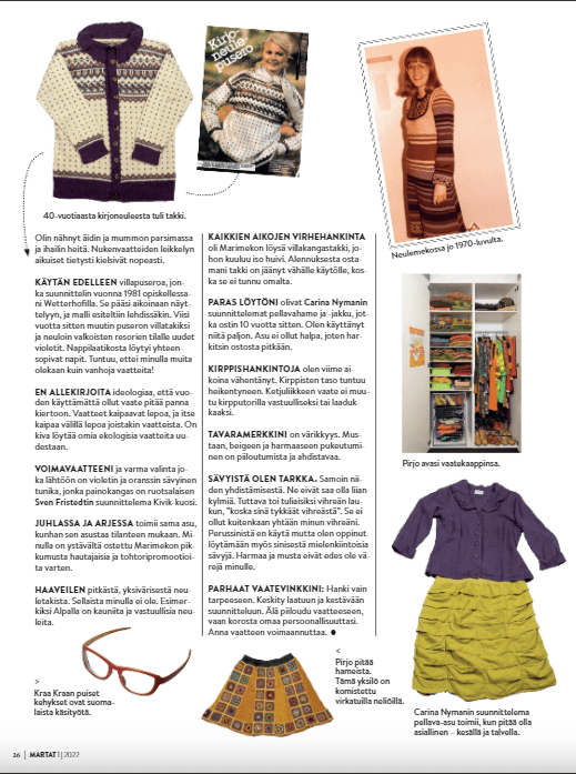 Marttalehden haastattelussa kerron, että minulle vaatteiden tarinat, kestävyys ja huoltaminen ovat värien ohella tärkeitä. Etenkin värit voimaannuttavat ja hyvää mieltä tuo myös se, kun voi hankkia suomalaisia tuotteita, vähintäänkin Suomessa suunniteltuja, mutta mielellään myös Suomessa valmistettuja. Ja toki myös itse tekeminen mahdollisimman ekologisista materiaaleista.