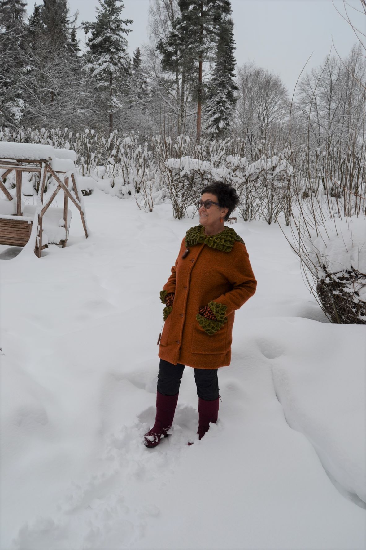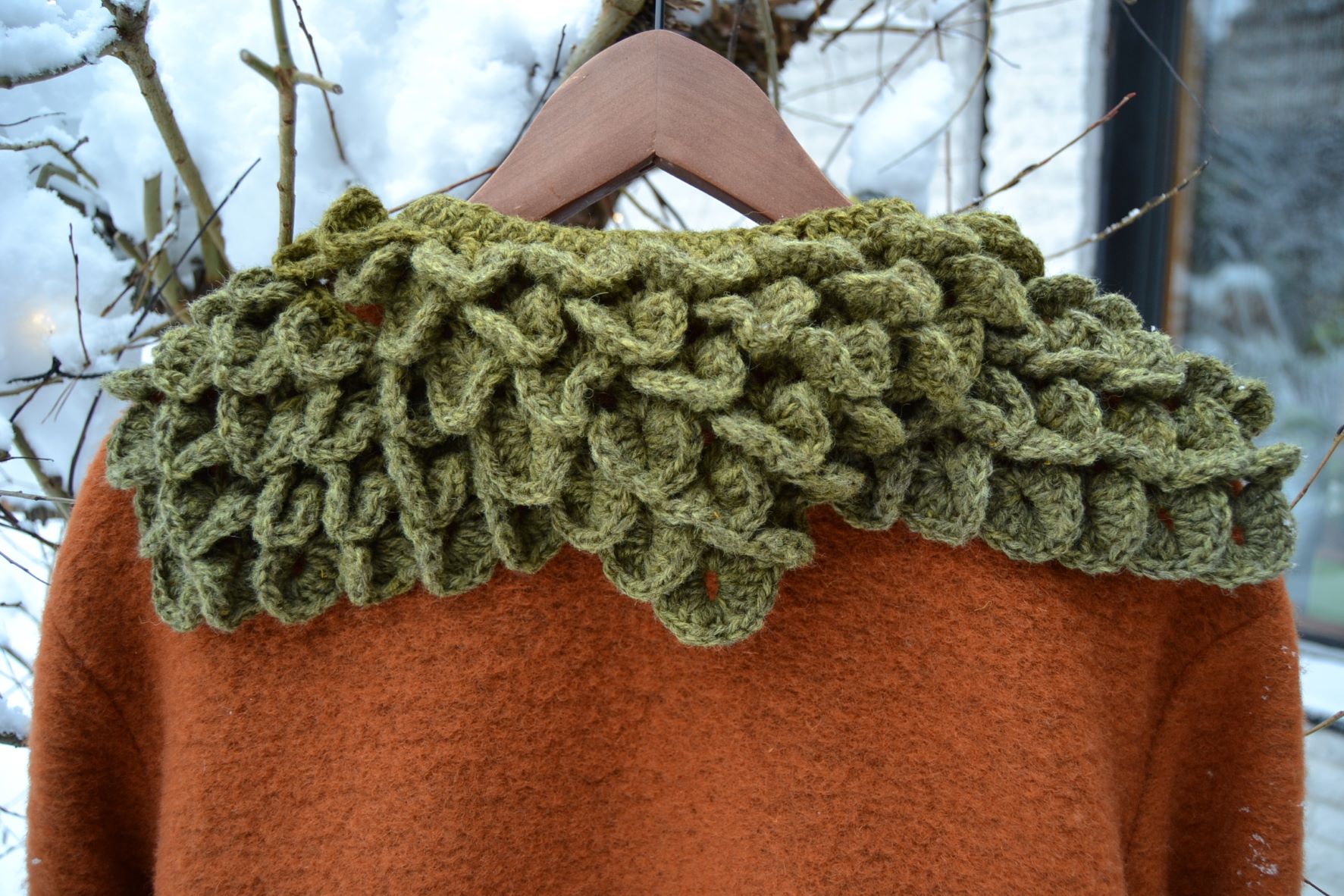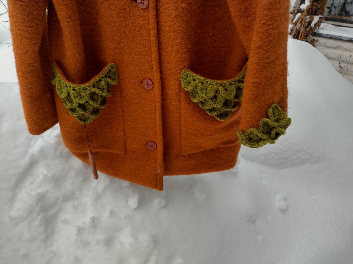 Viime kesällä värjäsin Kiipulalangat keittovärjäyksellä keltasipulinkuorilla. Sain harmaaseen lankaa hienoja vihreitä sävyjä. Olen huono käyttämään paksuja lankoja, mutta takin kaulukseen ne sopivat hyvin. Virkkasin kaulusta varten krokotiilivirkkauksella kolmioita. Sain muhkean kauluksen.
