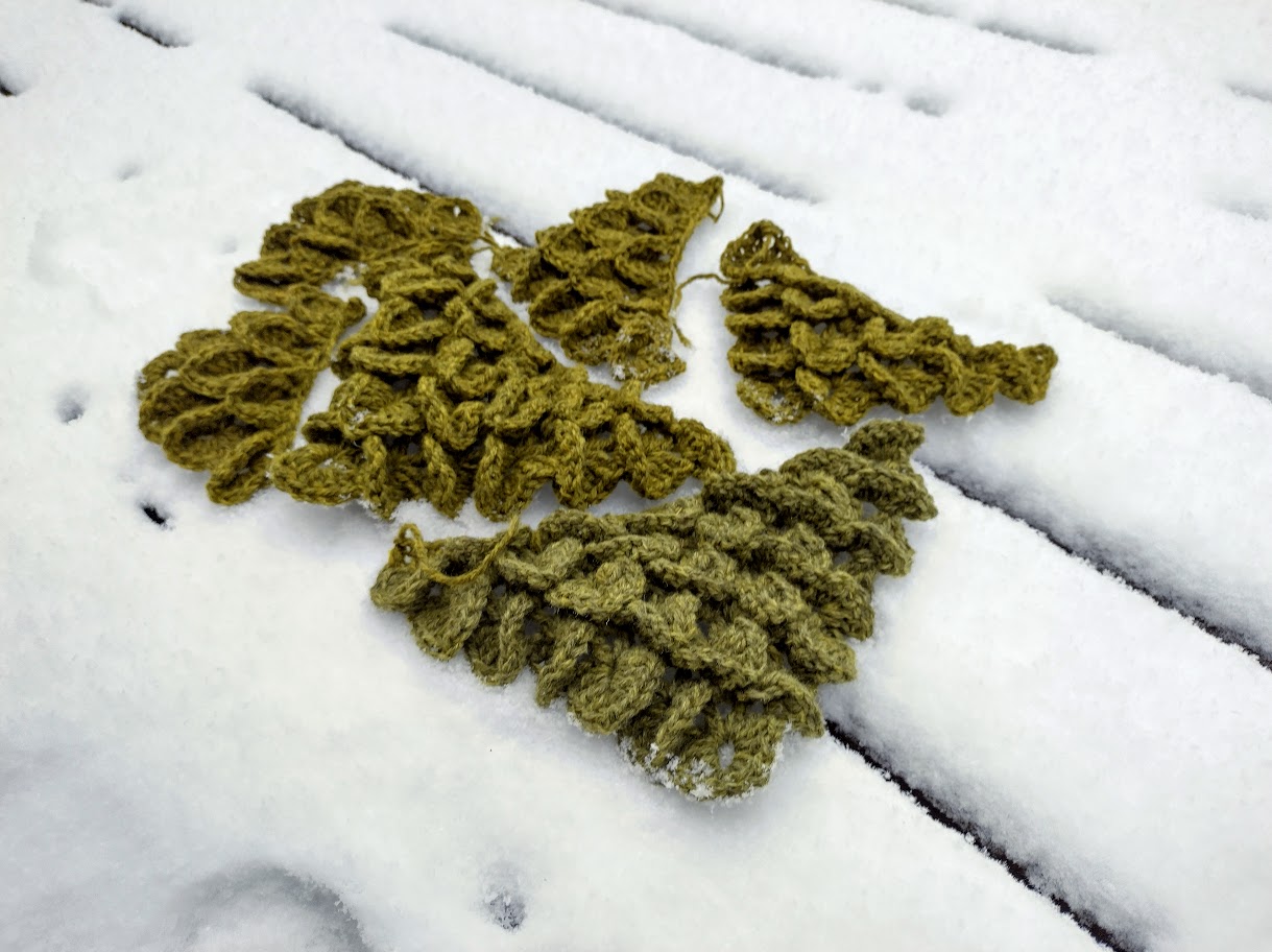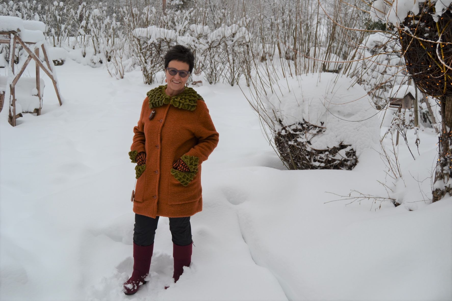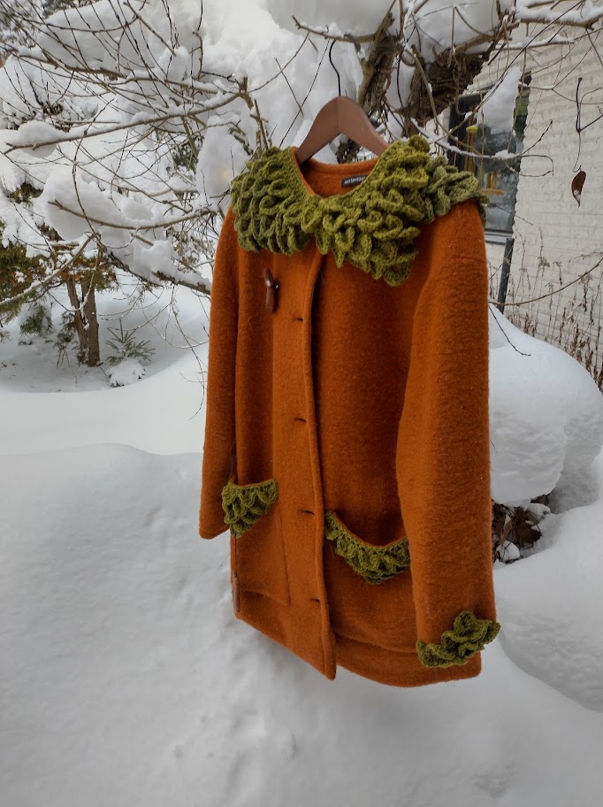 Viime kesällä värjäsin Kiipulalangat keittovärjäyksellä keltasipulinkuorilla. Sain harmaaseen lankaa hienoja vihreitä sävyjä. Olen huono käyttämään paksuja lankoja, mutta takin kaulukseen ne sopivat hyvin. Virkkasin kaulusta varten krokotiilivirkkauksella kolmioita. Sain muhkean kauluksen.