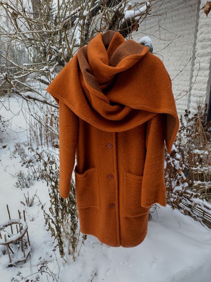 Oranssi villakankainen Marimekon takki puoleenhintaan tuntui vuosia sitten ehdottoman hyvältä extemporehankinnalta. Takki on kuitenkin jäänyt vähälle käytölle, koska ei ole tuntunut käytössä ihan omalta mm. pituudeltaan ja kauluksettomana. Takkiin kuuluu kyllä pitkä irtohuivi, jonka voi kietoa kaulalle, mutta en ole senkään kanssa ollut oikein sinut.