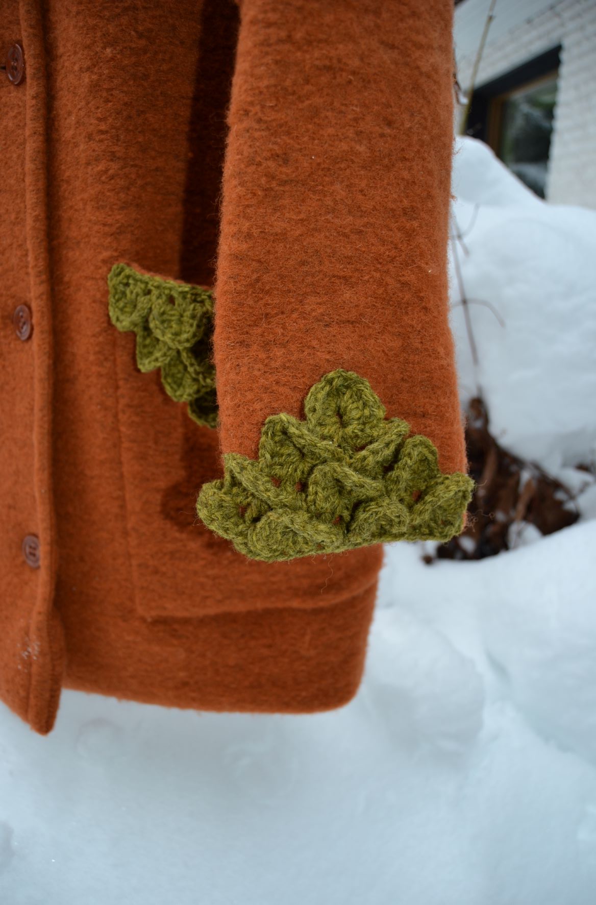 Koska lankaa jäi vielä, virkkasin sopivankokoiset kolmiot vielä hihansuihin ja taskunreunoihin. Täydelliset turkissomisteen suomalaisen lampaan- ja kaninvillasta. Ompelin kaikki osat käsin ohuella villalangalla kiinni.
