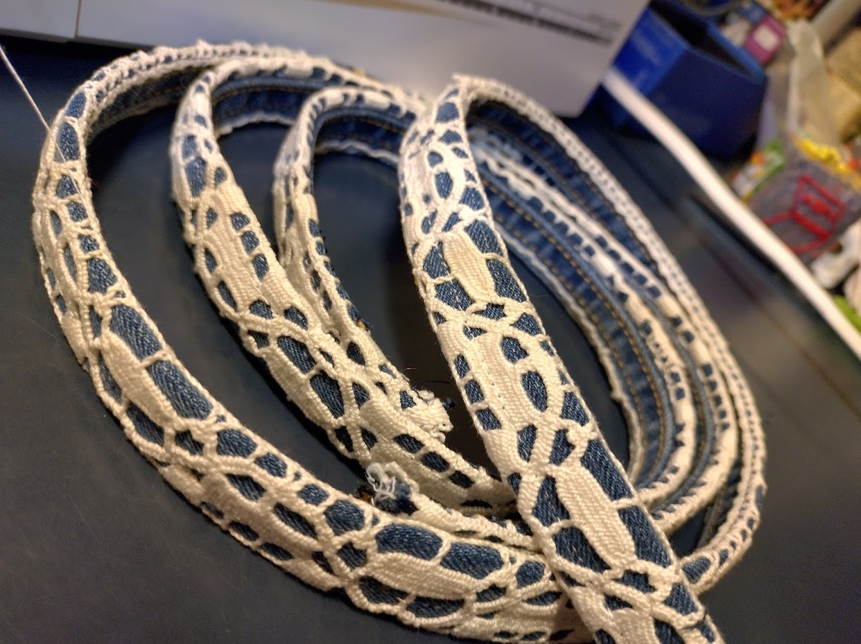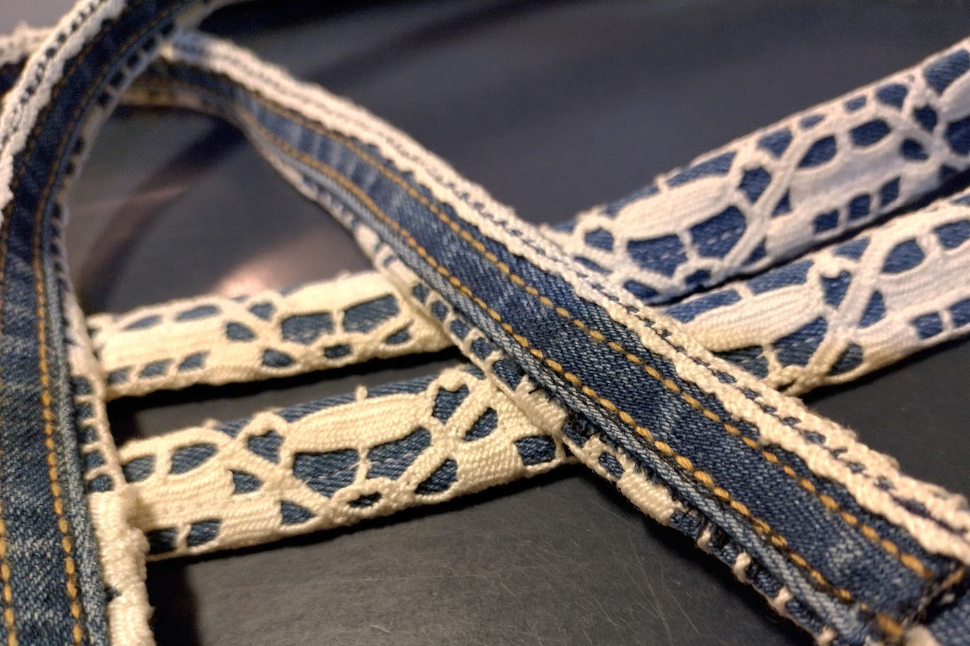 Hihnaa varten leikkasin kaitaleen, jonka sivussa oli farkunsaumaa. Päällystin hihnakaitaleet teollisella vanhalla kertaalleen jo käytetyllä pitsillä ja ompelin hihnan valmiiksi. Mielestäni pitsin käyttö oli hyvä idea ja lopputulos sopii kirjotun farkkukassin kanssa yhteen. Ja nuppineulat korvaavat kipsit olivat minulle uusi tuttavuus, ostin heti pussillisen, niin käteviä olivat käyttää kiinnityksissä.