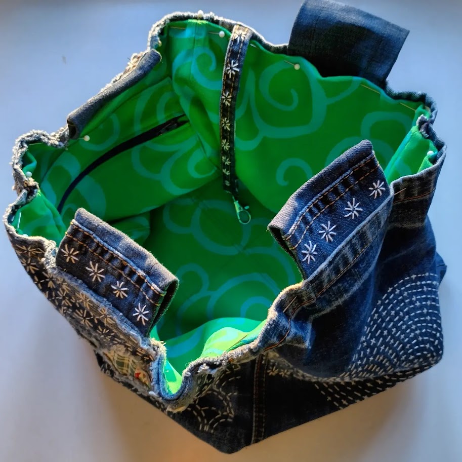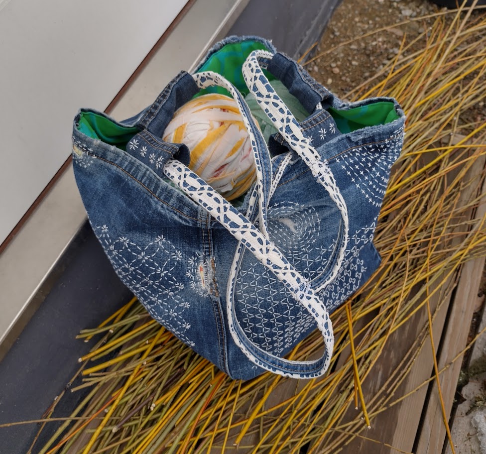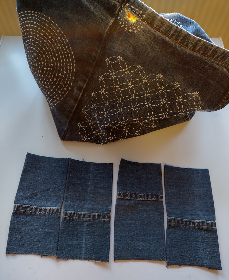 Kassini pohjakangas on poikani farkuista, ajalta jolloin housujen piti olla isot ja roikkua persuksista. Hyvä pohja sashikolle, sillä kangasta on housuissa paljon ja se on oikeaa vahvaa puuvillafarkkua ilman elastaania. Koska housut ovat roikkuneet, on niiden puntit myös kuluneet takaa puhki, taisi olla yksi reikä myös pyöränpinnojen väliin jäämisestä muistona. Onneksi en leikannut ennen kurssin alkua risoja lahkeita pois, vaan aloitin työn vasta kurssilla. Sillä yksi osa ideologiaa on korjata ja jättää korjaukset näkyviin, näin lopputulos on ainutkertainen, eikä sitä voi jäljitellä tai toistaa. Hoisujen tarina jää elämään osana kassin alkavaa tarinaa. Ja ehkä räppäyksen farkut eivät olleet just nämä yksilöt, mutta tarina on tosi.